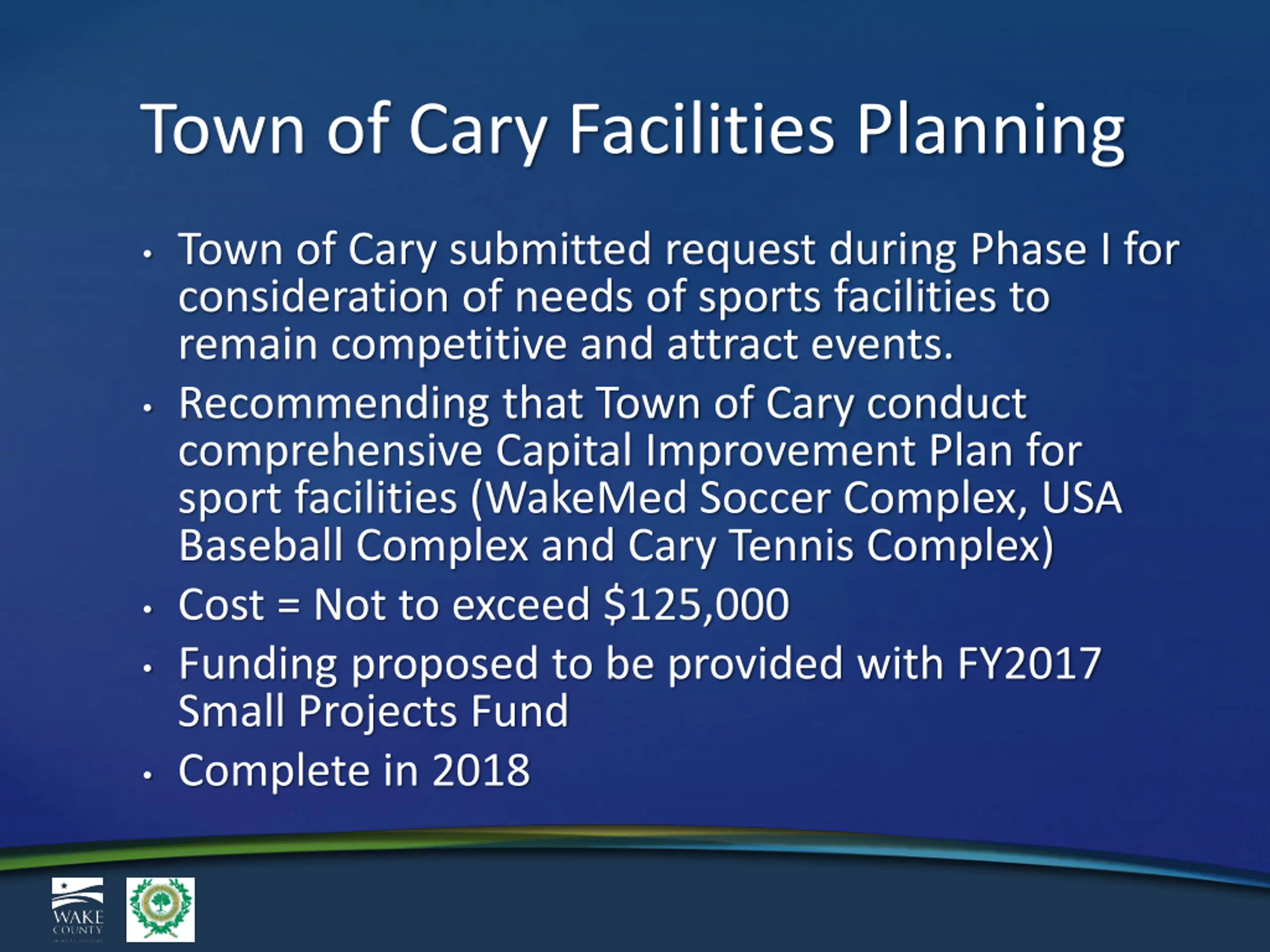 Town of Cary Facilities Planning Town of Cary submitted request during Phase I for consideration of needs of sports facilities to remain competitive and attract events. Recommending that Town of Cary conduct comprehensive Capital Improvement Plan for sport facilities (WakeMed Soccer Complex, USA Baseball Complex and Cary Tennis Complex) Cost = Not to exceed $125,000 Funding proposed to be provided with FY2017 Small Projects Fund Complete in 2018