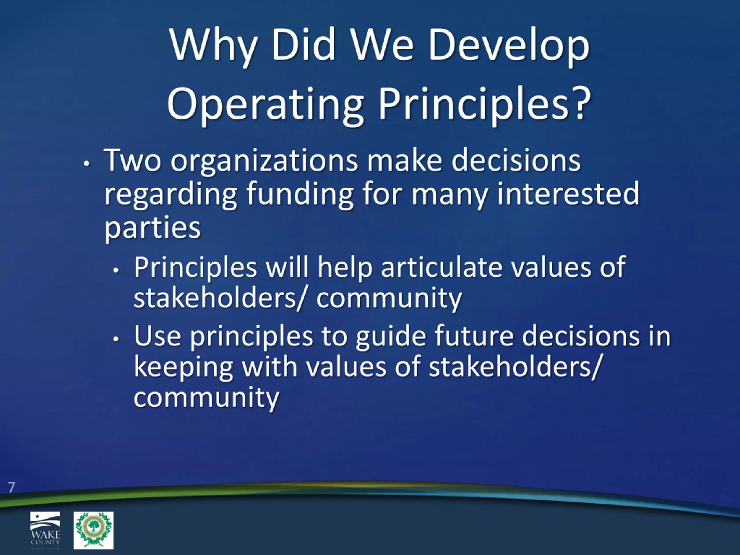 Why Did We Develop Operating Principles? Two organizations make decisions regarding funding for many interested parties Principles will help articulate values of stakeholders/ community Use principles to guide future decisions in keeping with values of stakeholders/ community