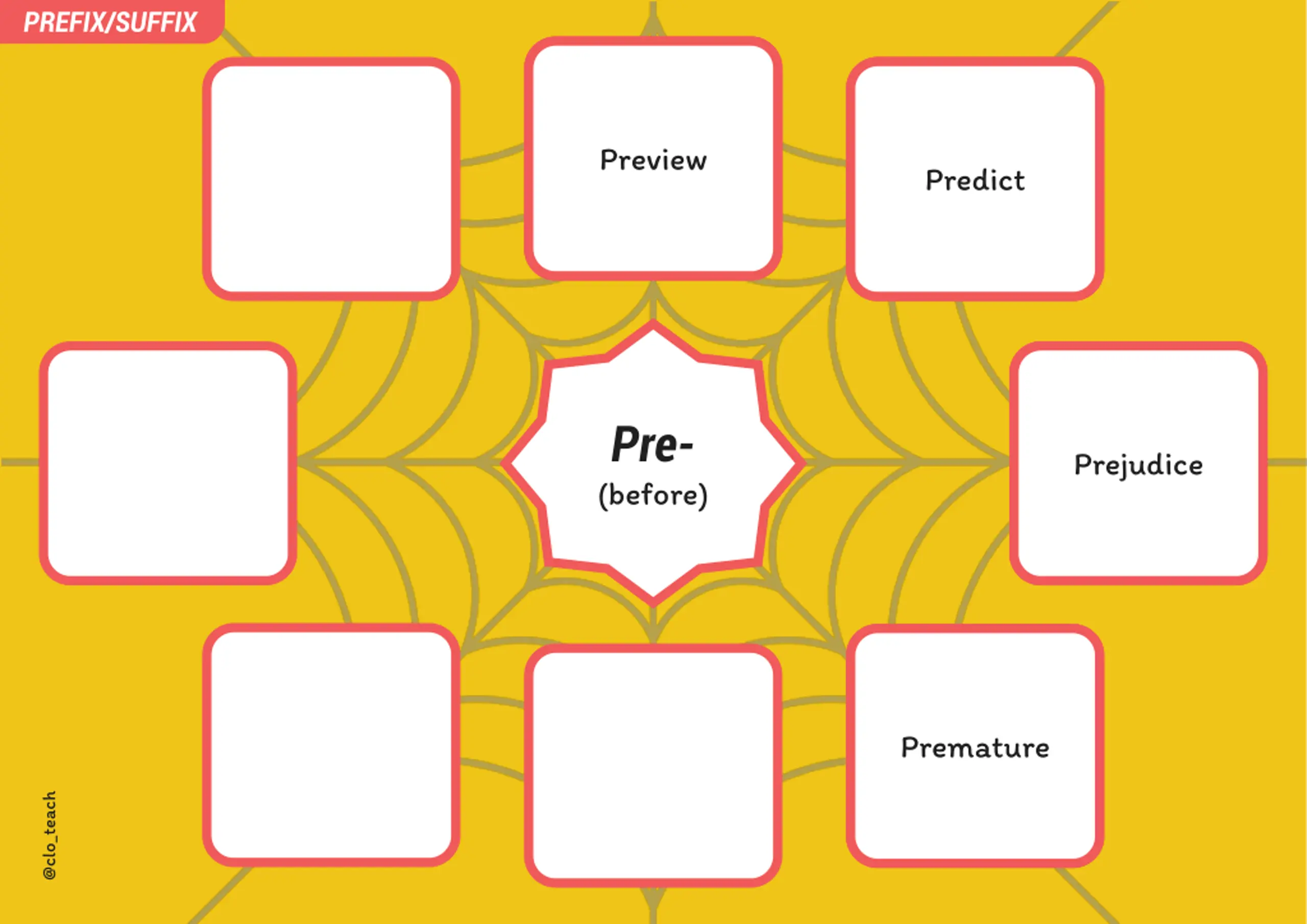 PREFIX/SUFFIX Preview Predict Pre- (before) Prejudice Premature @clo_teach