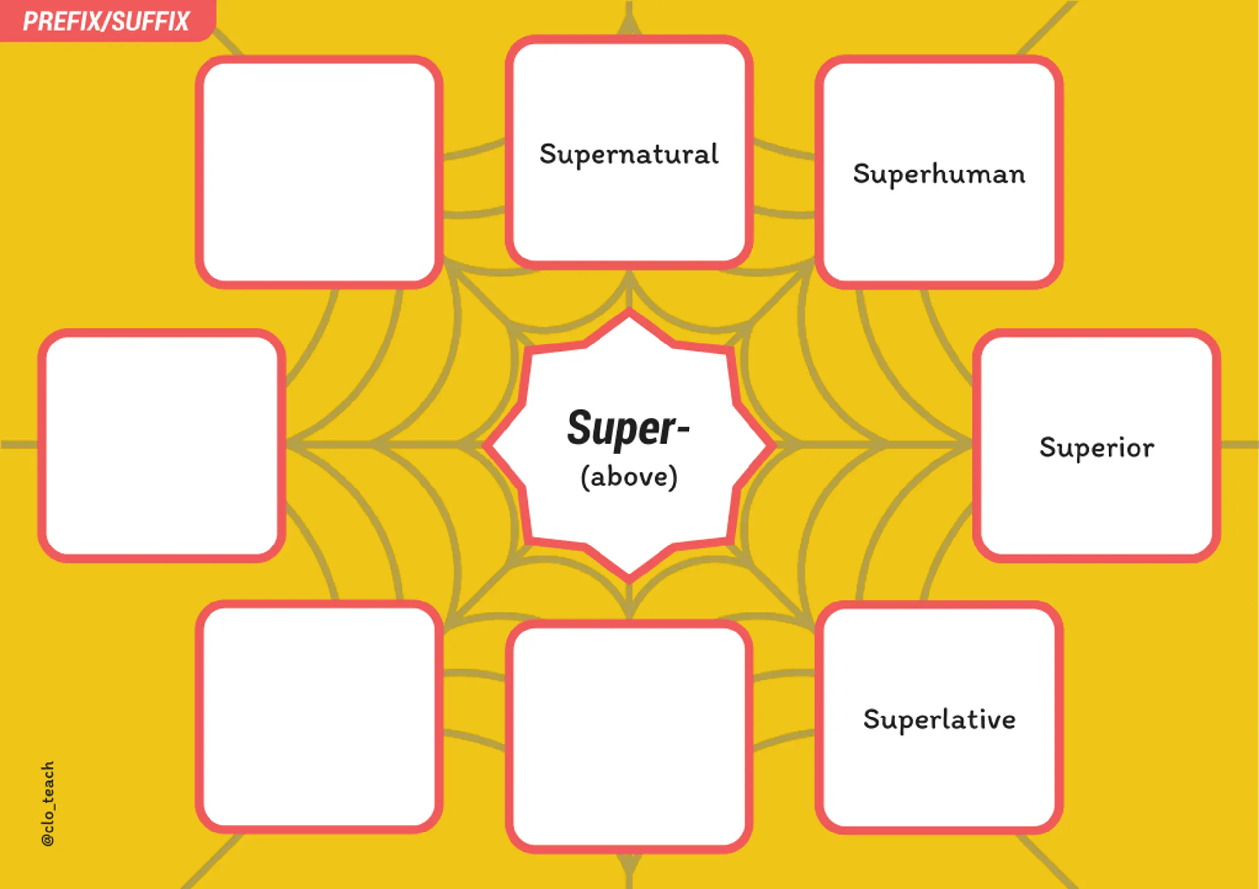PREFIX/SUFFIX Supernatural Superhuman Super- (above) Superior Superlative @clo_teach