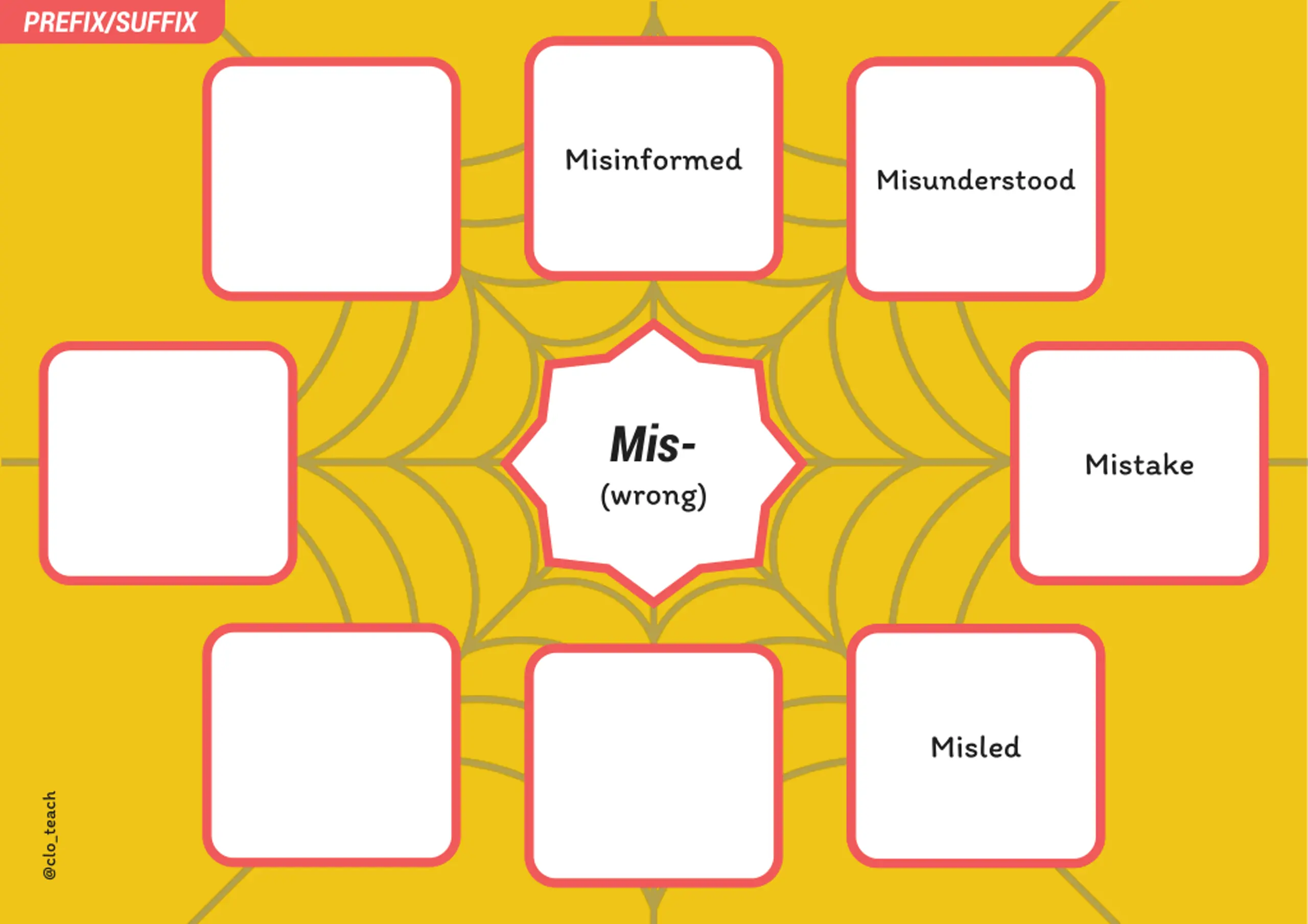 PREFIX/SUFFIX Misinformed Misunderstood Mis- (wrong) Mistake Misled @clo_teach