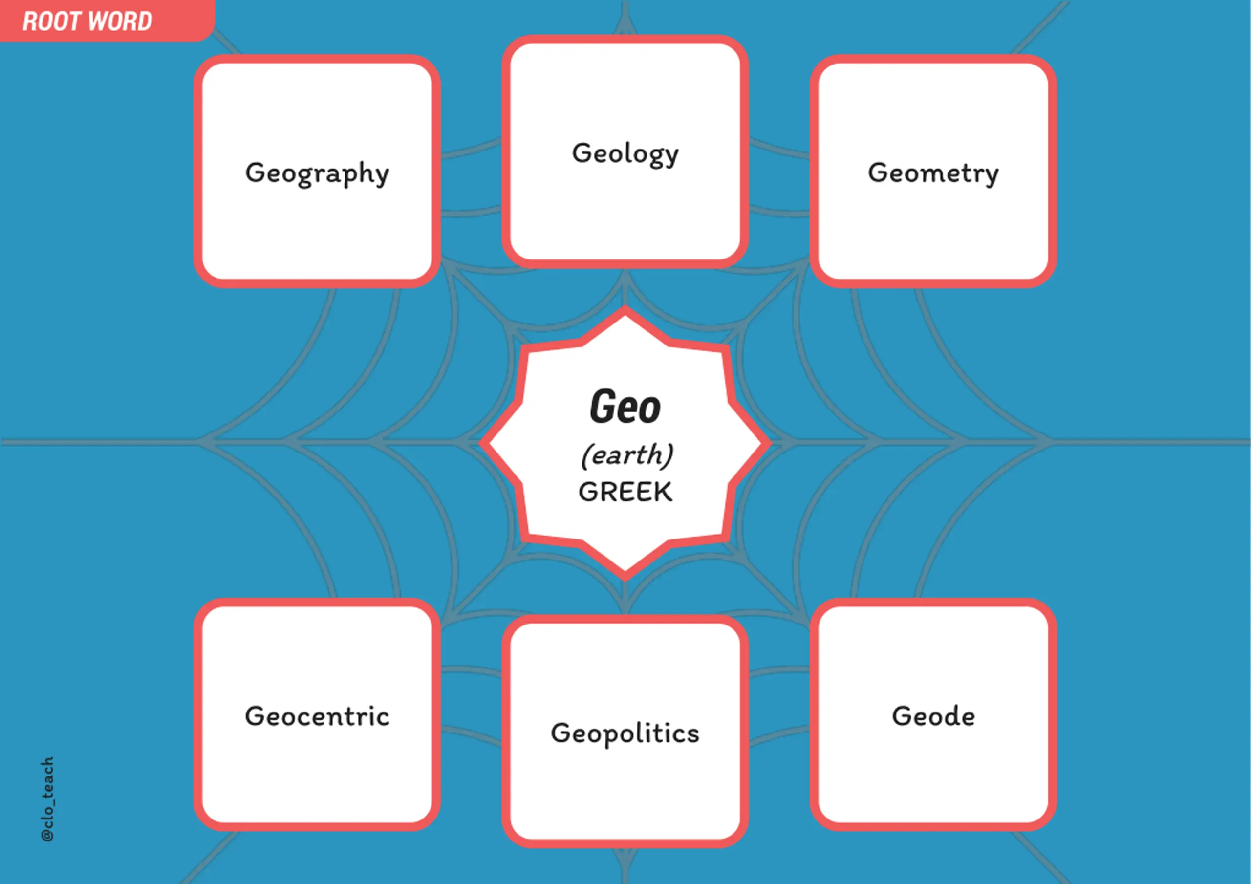 ROOT WORD Study of the Earth s climate, continents and people Maths dealing with lines, angles and surfaces The science of rocks Geology Geography Geometry Geo (earth) GREEK The Having the Earth at the centre of the solar system A rock cavity lined with crystals combination of geographic and political factors Geocentric Geode Geopolitics @clo_teach