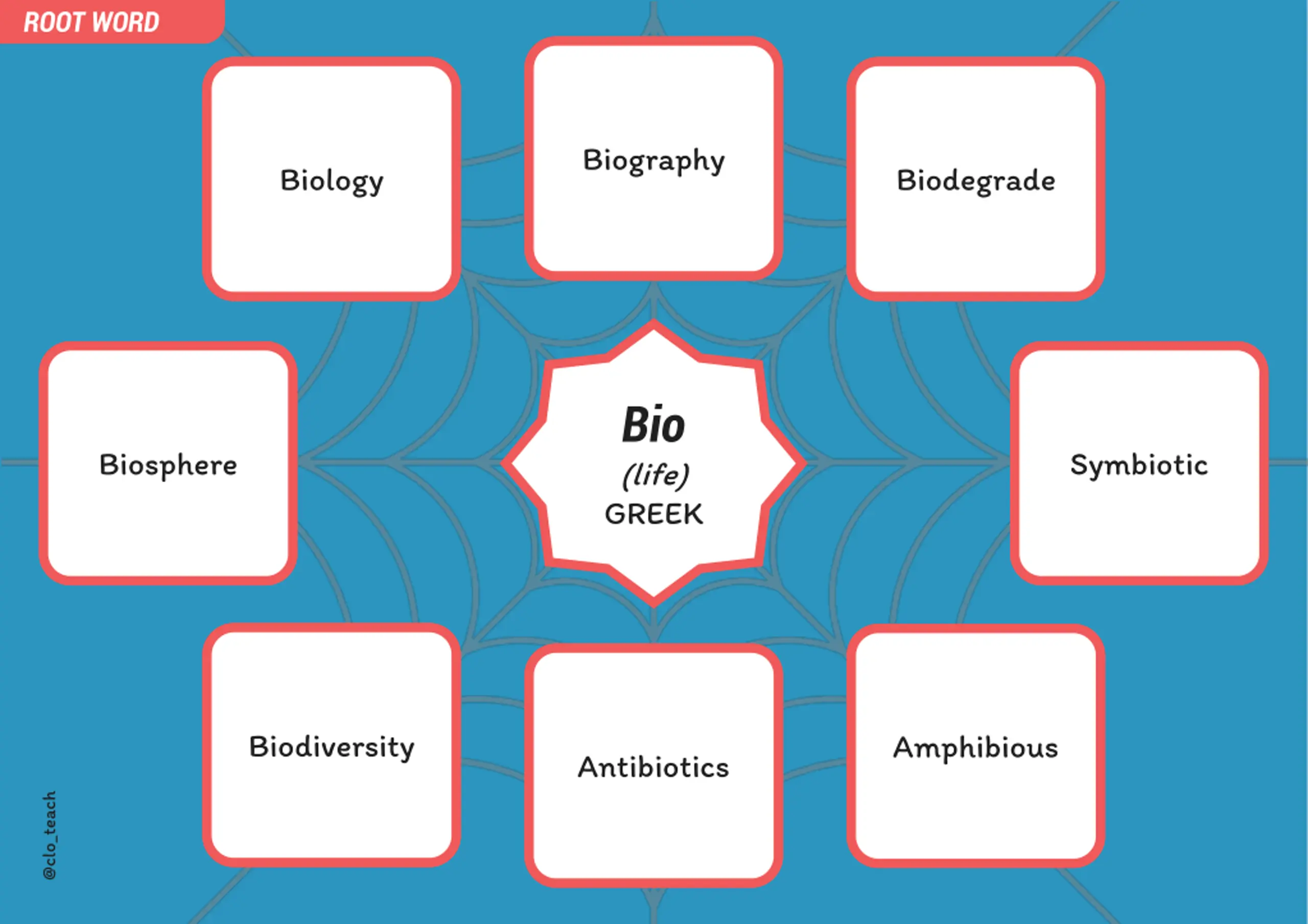 ROOT WORD The story of a person s life To break down naturally over time Biography The study of living things Biology Biodegrade Two Bio (life) GREEK The zone of Earth where life exists organisms combined for mutual benefit Biosphere Symbiotic An animal that lives on land and in water A wide variety of plants and animals Medicines that cure bacterial infections Biodiversity Amphibious Antibiotics @clo_teach