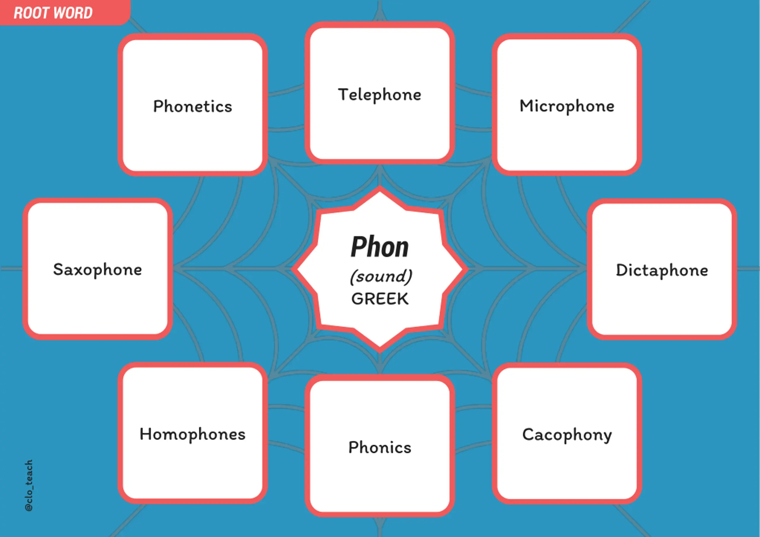 ROOT WORD What you use to make calls The study of the sound of human speech A device to make your voice louder Telephone Microphone Phonetics A curved metal woodwind instrument Phon (sound) GREEK A device used to record spoken notes Saxophone Dictaphone Words that sound the same but have different meanings Sounds and the letters that represent them Harsh sounds, or a bad noise Homophones Cacophony Phonics @clo_teach