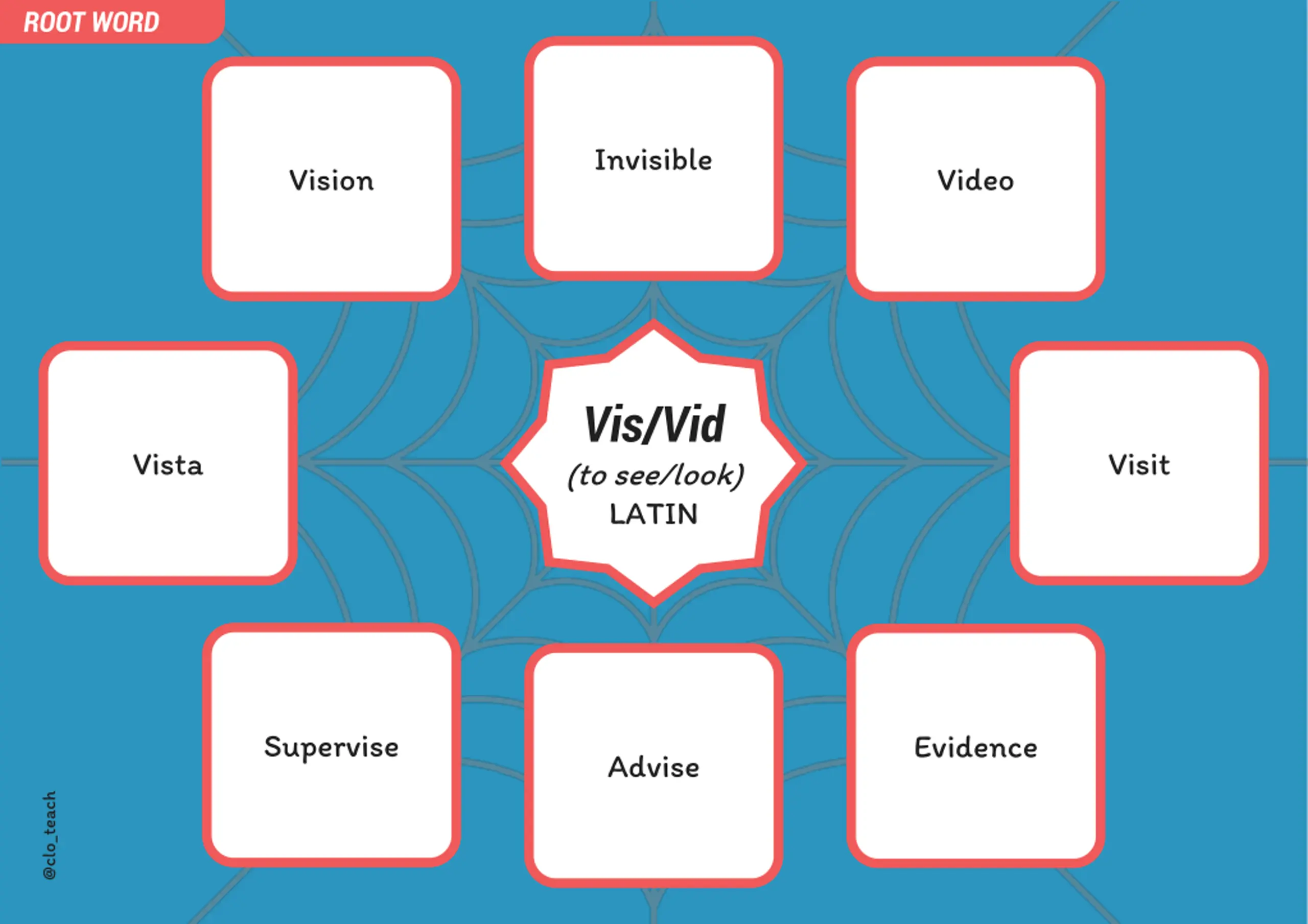 ROOT WORD Unable to be seen A recording that can be seen Invisible The ability to see Vision Video Vis/Vid (to see/look) LATIN A view from a distance A trip to see someone Vista Visit Offer To oversee or take charge Supervise Visual proof Evidence suggestions/ your point of view Advise @clo_teach