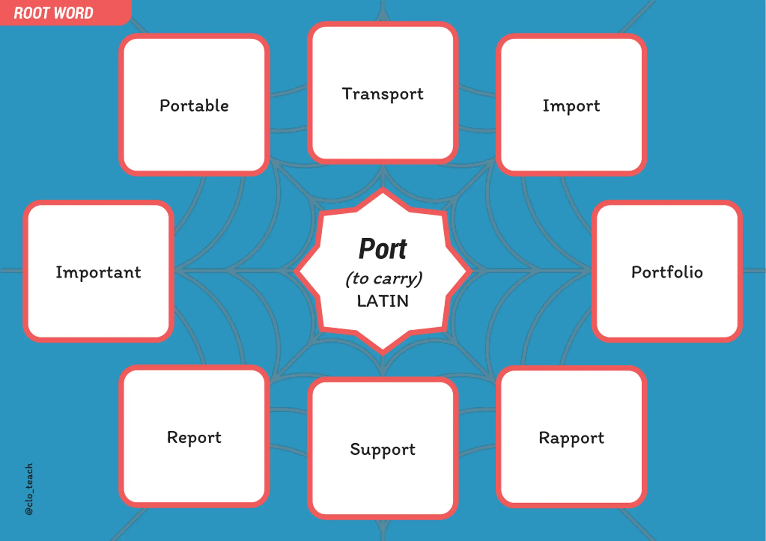 ROOT WORD To carry something from place to place Capable of being carried easily Transport To carry into the country Portable Import Port (to carry) LATIN A case for carrying loose papers Carrying significance Important Portfolio A personal connection (you take something from) A collection of writing carrying information To carry the weight of something Report Rapport Support @clo_teach