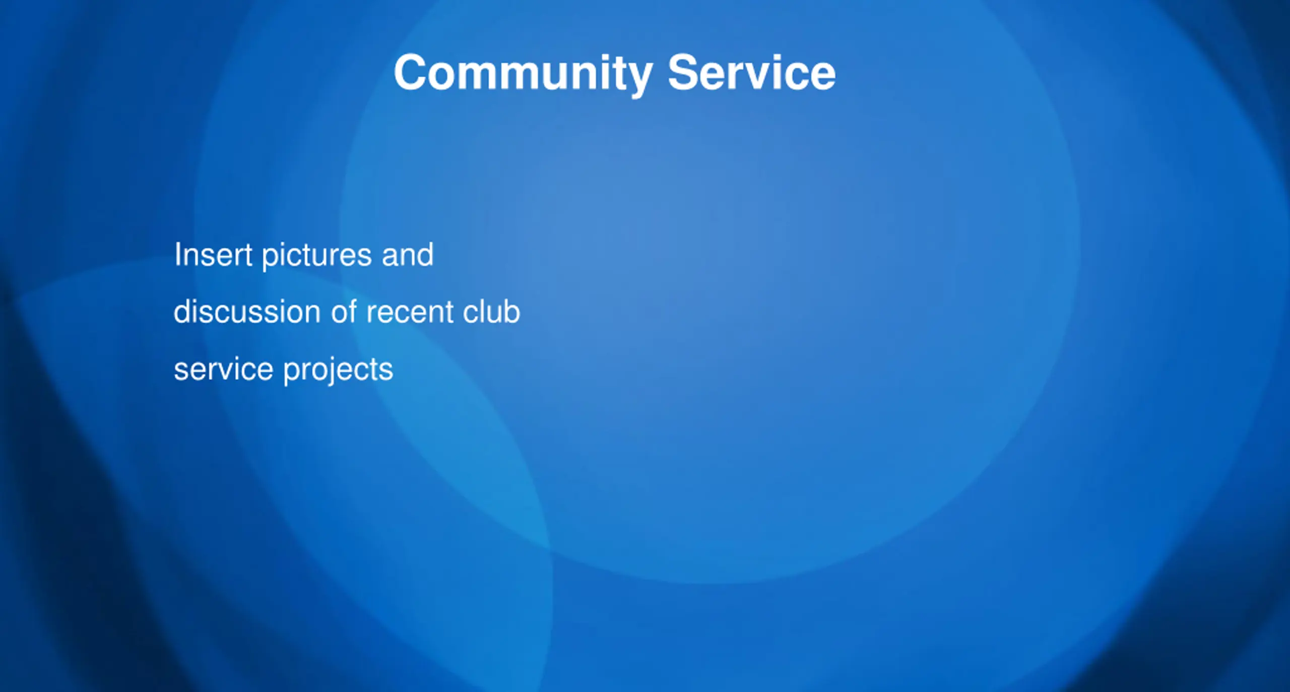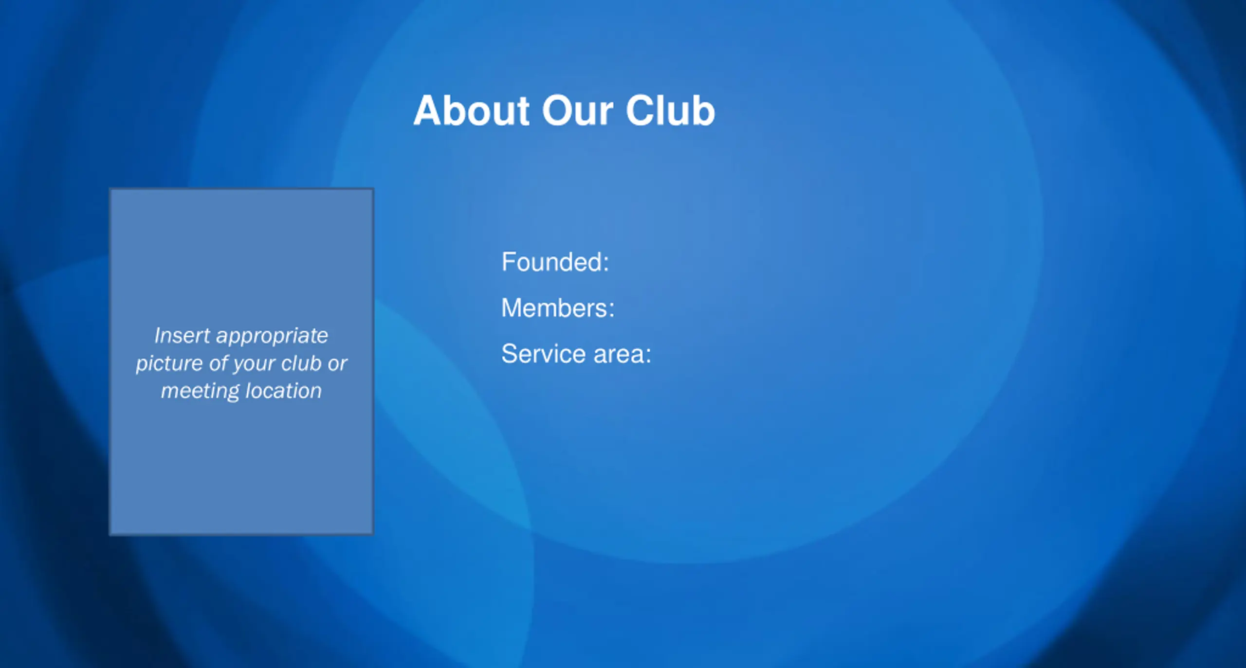 About Our Club Founded: Members: Insert appropriate picture of your club or meeting location Service area: