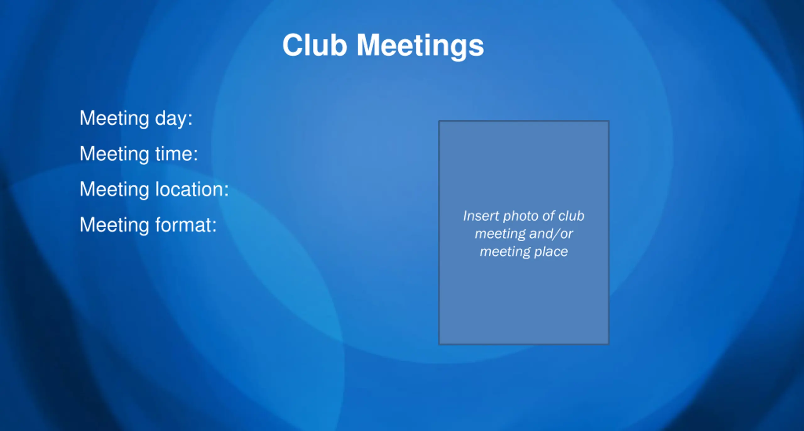 Club Meetings Meeting day: Meeting time: Meeting location: Insert photo of club meeting and/or meeting place Meeting format: