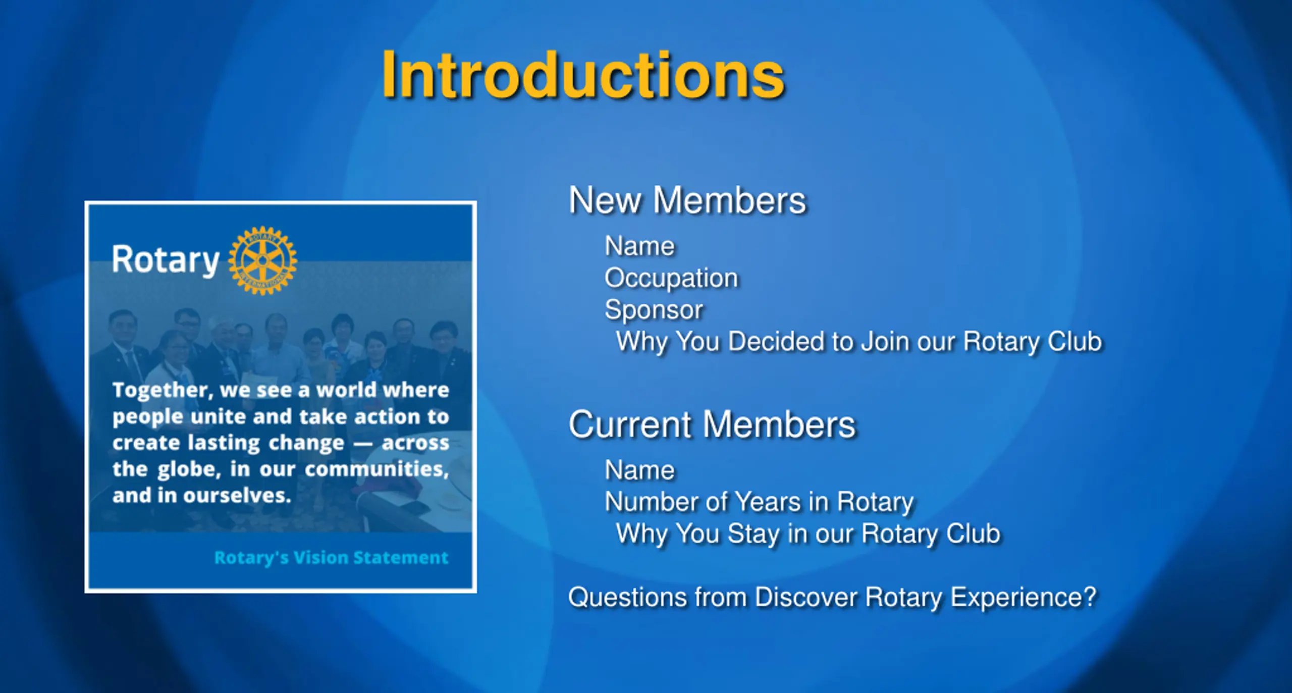 Introductions New Members Name Occupation Sponsor Why You Decided to Join our Rotary Club Current Members Name Number of Years in Rotary Why You Stay in our Rotary Club Questions from Discover Rotary Experience?