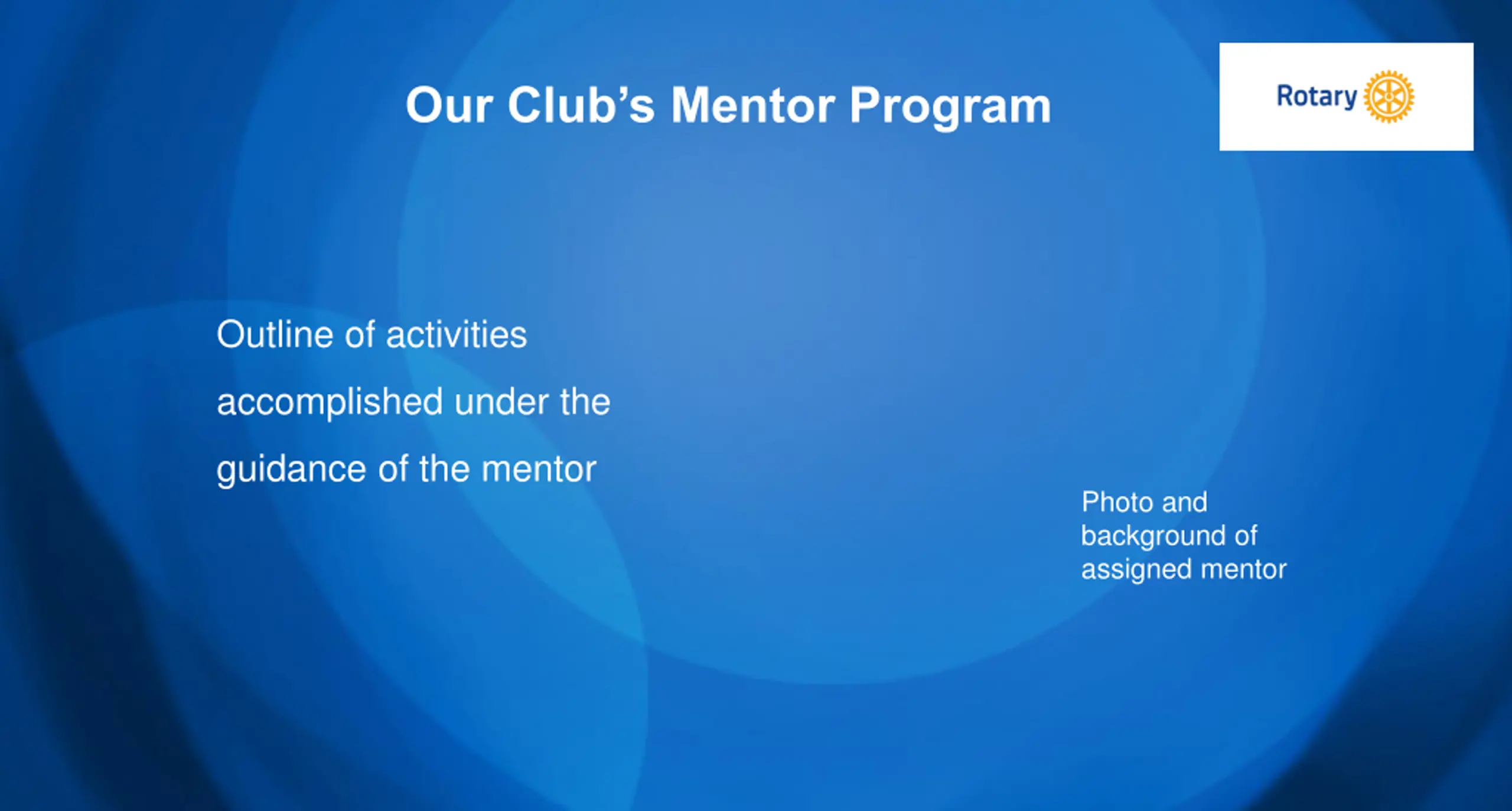 Our Clubs Mentor Program Outline of activities accomplished under the guidance of the mentor Photo and background of assigned mentor