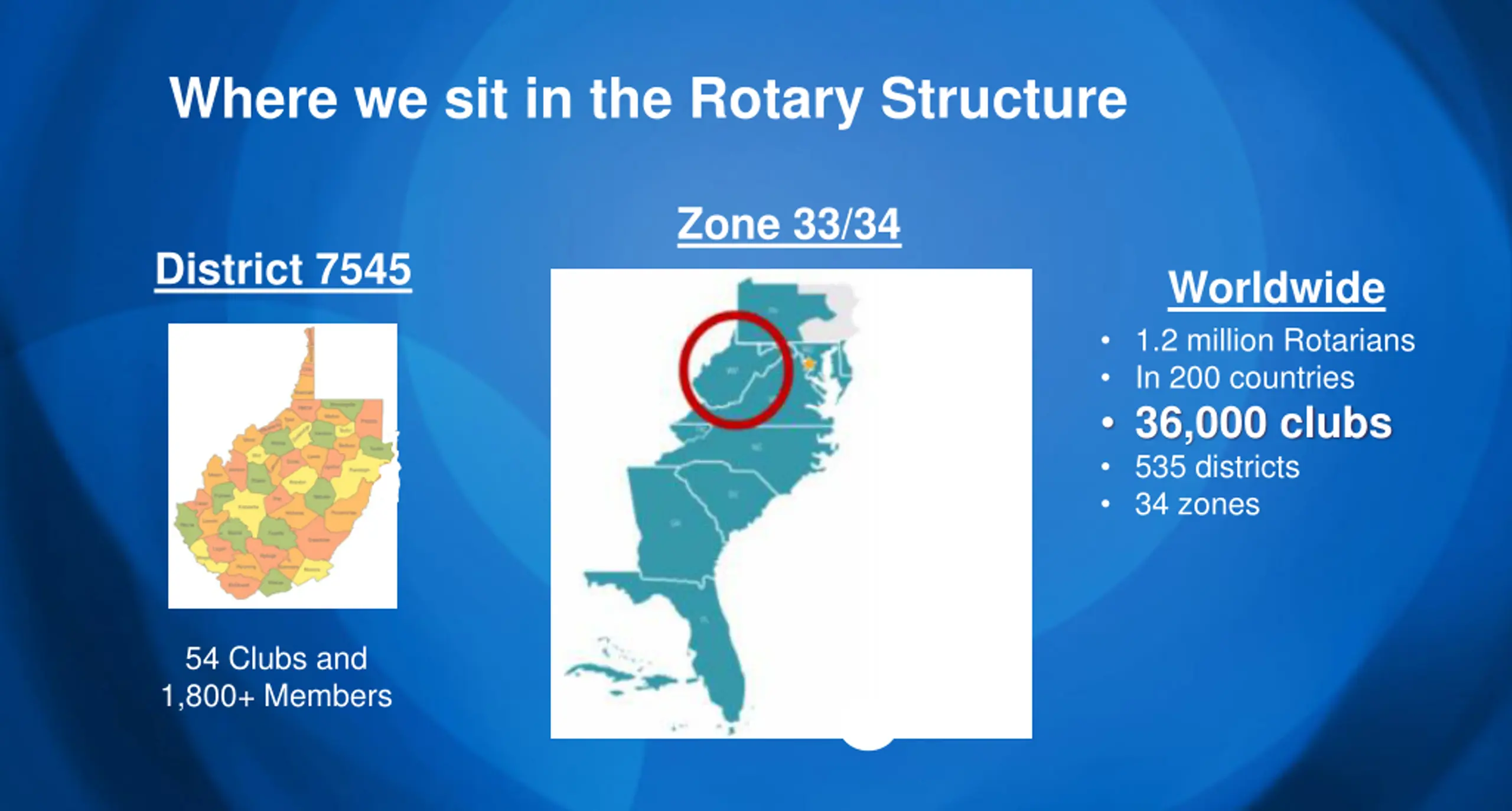 Where we sit in the Rotary Structure Zone 33/34 District 7545 Worldwide 1.2 million Rotarians In 200 countries 36,000 clubs 535 districts 34 zones 54 Clubs and 1,800+ Members