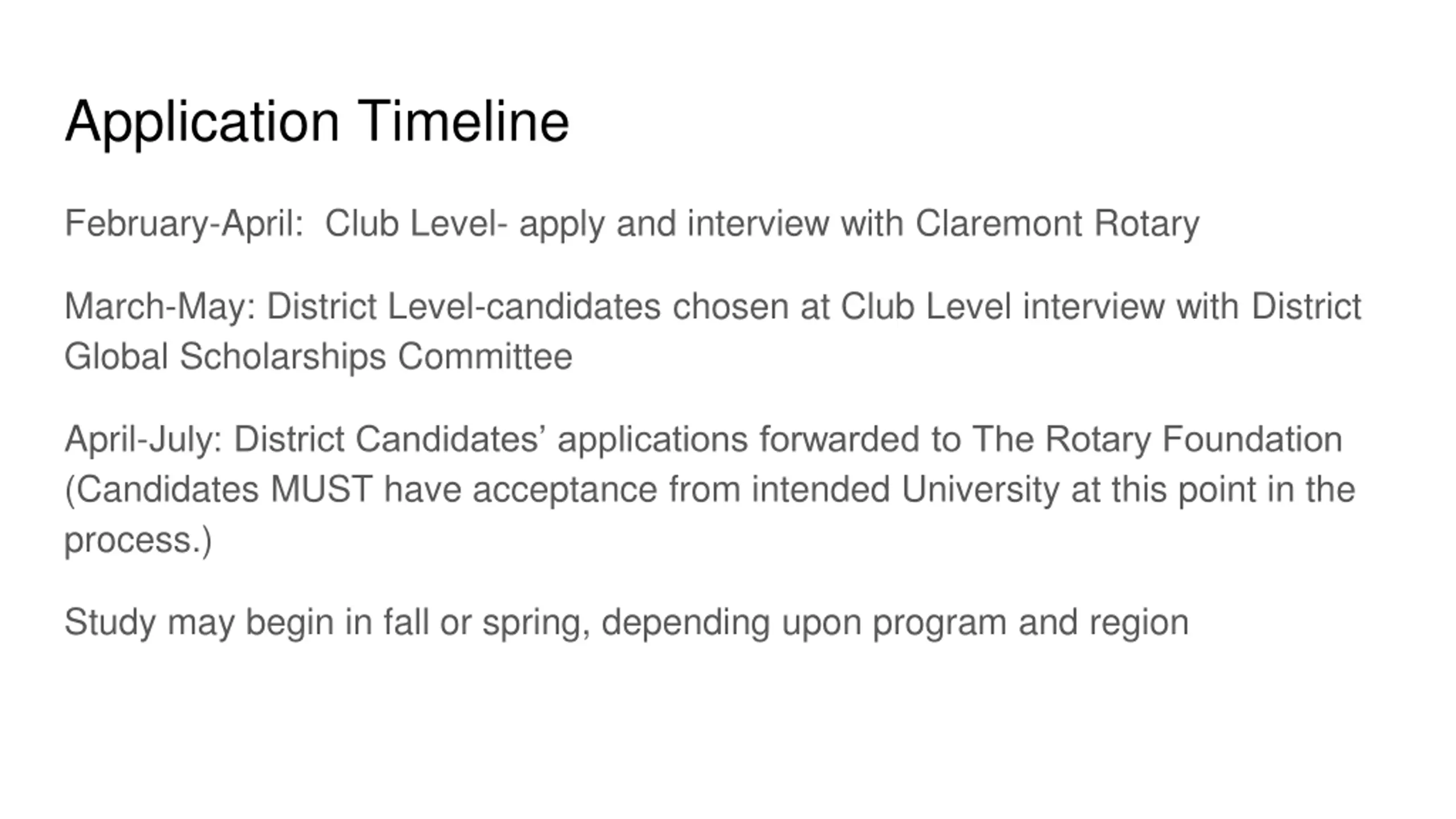 Application Timeline February-April: Club Level- apply and interview with Claremont Rotary March-May: District Level-candidates chosen at Club Level interview with District Global Scholarships Committee April-July: District Candidates applications forwarded to The Rotary Foundation (Candidates MUST have acceptance from intended University at this point in the process.) Study may begin in fall or spring, depending upon program and region