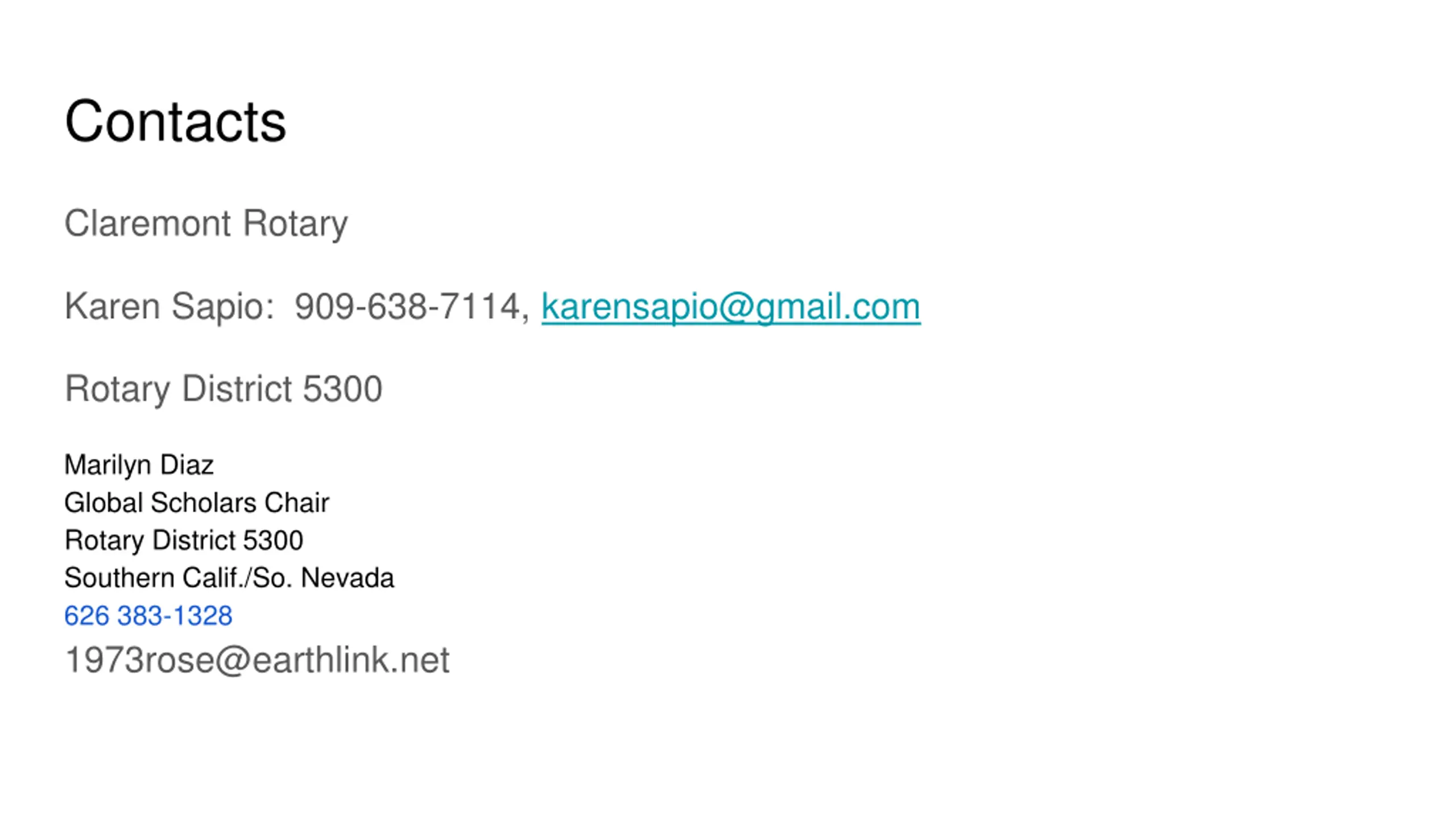 Contacts Claremont Rotary Karen Sapio: 909-638-7114, karensapio@gmail.com Rotary District 5300 Marilyn Diaz Global Scholars Chair Rotary District 5300 Southern Calif./So. Nevada 626 383-1328 1973rose@earthlink.net