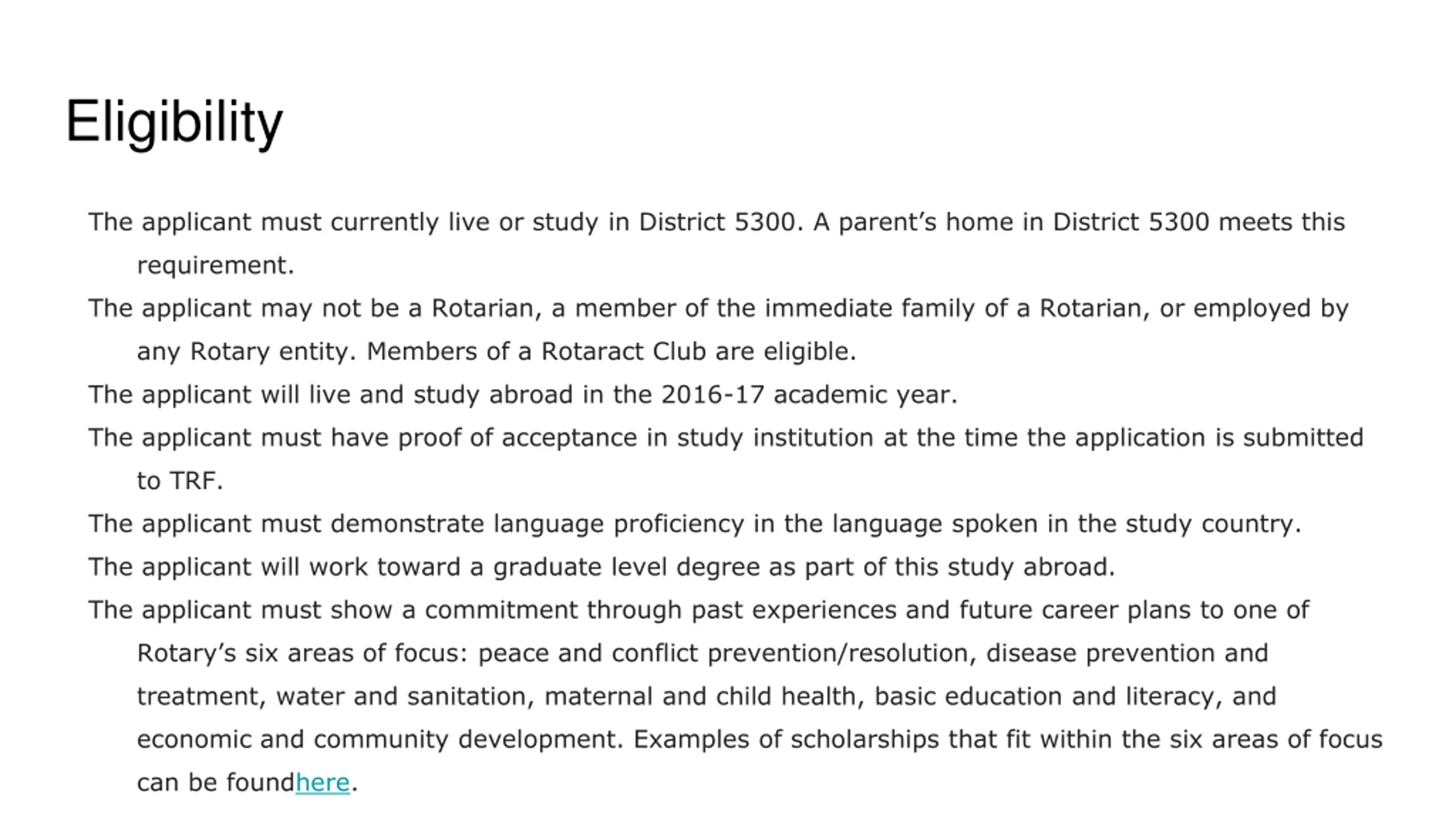 Eligibility The applicant must currently live or study in District 5300. A parent s home in District 5300 meets this requirement. The applicant may not be a Rotarian, a member of the immediate family of a Rotarian, or employed by any Rotary entity. Members of a Rotaract Club are eligible. The applicant will live and study abroad in the 2016-17 academic year. The applicant must have proof of acceptance in study institution at the time the application is submitted to TRF. The applicant must demonstrate language proficiency in the language spoken in the study country. The applicant will work toward a graduate level degree as part of this study abroad. The applicant must show a commitment through past experiences and future career plans to one of Rotary s six areas of focus: peace and conflict prevention/resolution, disease prevention and treatment, water and sanitation, maternal and child health, basic education and literacy, and economic and community development. Examples of scholarships that fit within the six areas of focus can be foundhere.