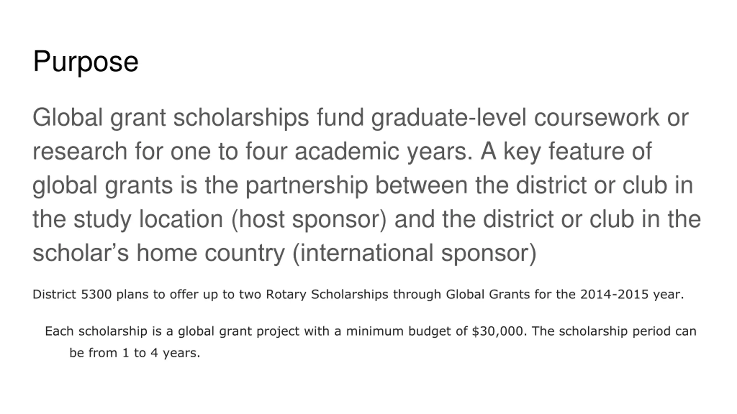 Purpose Global grant scholarships fund graduate-level coursework or research for one to four academic years. A key feature of global grants is the partnership between the district or club in the study location (host sponsor) and the district or club in the scholar s home country (international sponsor) District 5300 plans to offer up to two Rotary Scholarships through Global Grants for the 2014-2015 year. Each scholarship is a global grant project with a minimum budget of $30,000. The scholarship period can be from 1 to 4 years.