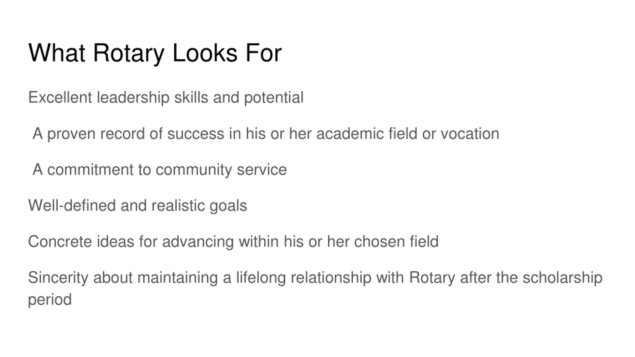 What Rotary Looks For Excellent leadership skills and potential A proven record of success in his or her academic field or vocation A commitment to community service Well-defined and realistic goals Concrete ideas for advancing within his or her chosen field Sincerity about maintaining a lifelong relationship with Rotary after the scholarship period