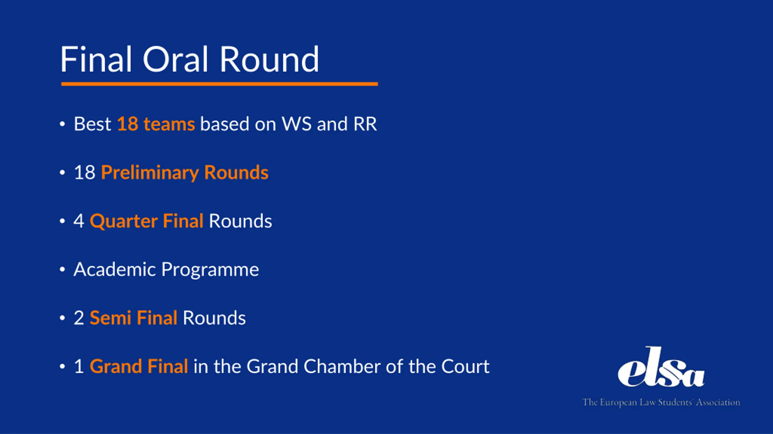 Final Oral Round Best 18 teams based on WS and RR 18 Preliminary Rounds 4 Quarter Final Rounds Academic Programme 2 Semi Final Rounds 1 Grand Final in the Grand Chamber of the Court