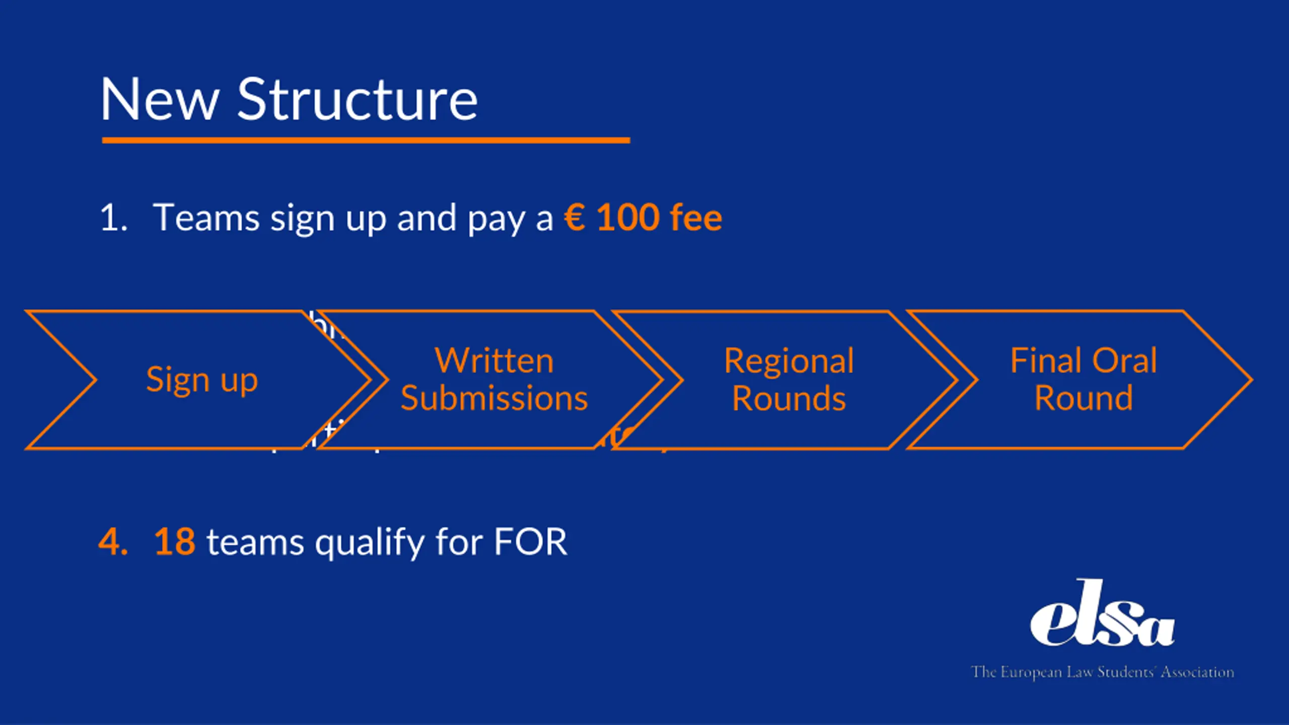 New Structure 1. Teams sign up and pay a 100 fee 2. Teams submit WS Sign up Written Submissions Final Oral Round Regional Rounds 3. Teams participate in mandatory RRs 4. 18 teams qualify for FOR