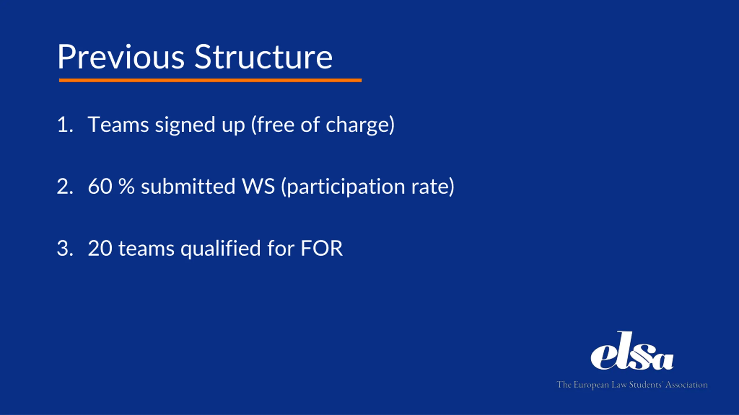 Previous Structure 1. Teams signed up (free of charge) 2. 60 % submitted WS (participation rate) 3. 20 teams qualified for FOR