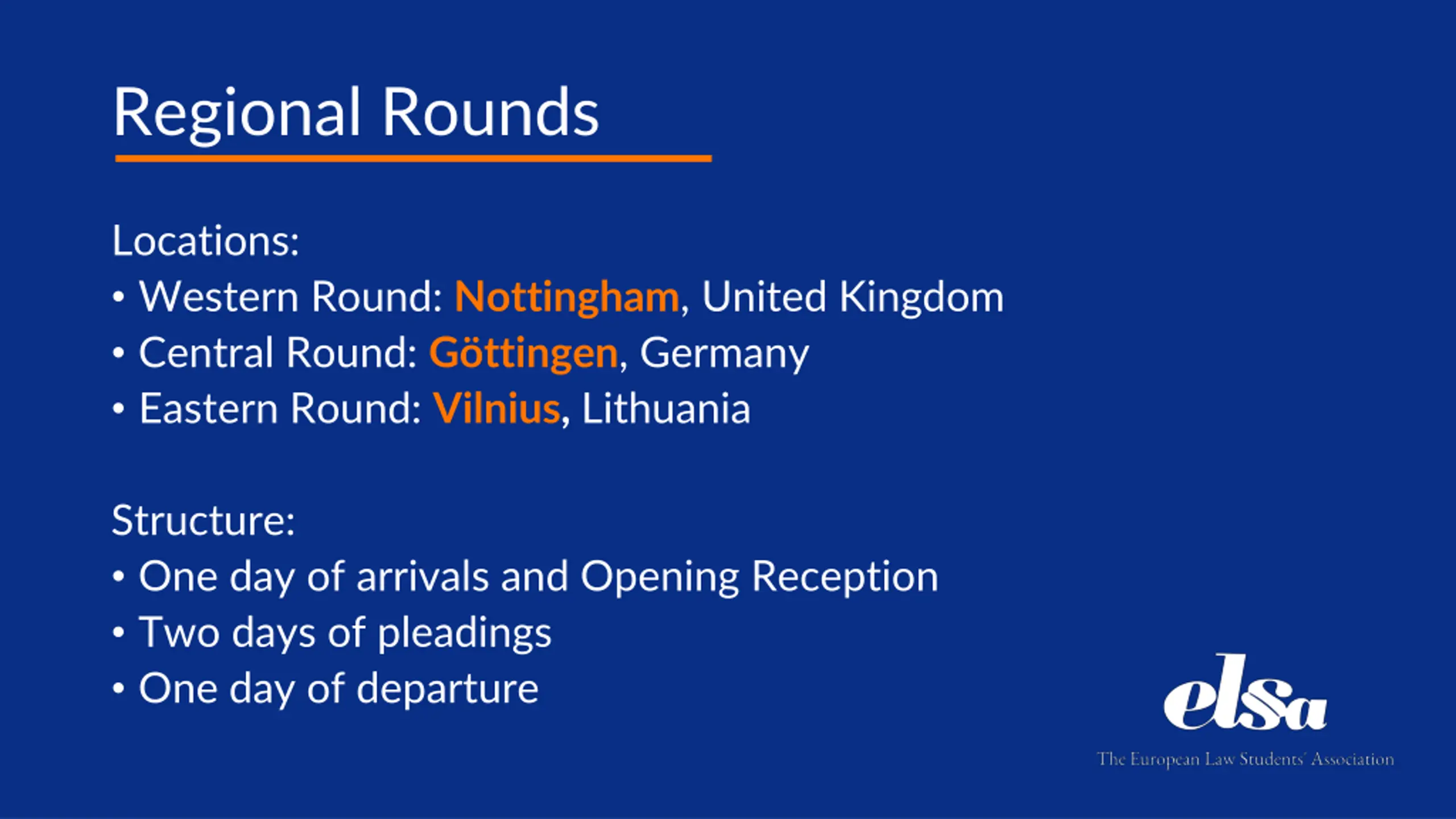 Regional Rounds Locations: Western Round: Nottingham, United Kingdom Central Round: G ttingen, Germany Eastern Round: Vilnius, Lithuania Structure: One day of arrivals and Opening Reception Two days of pleadings One day of departure
