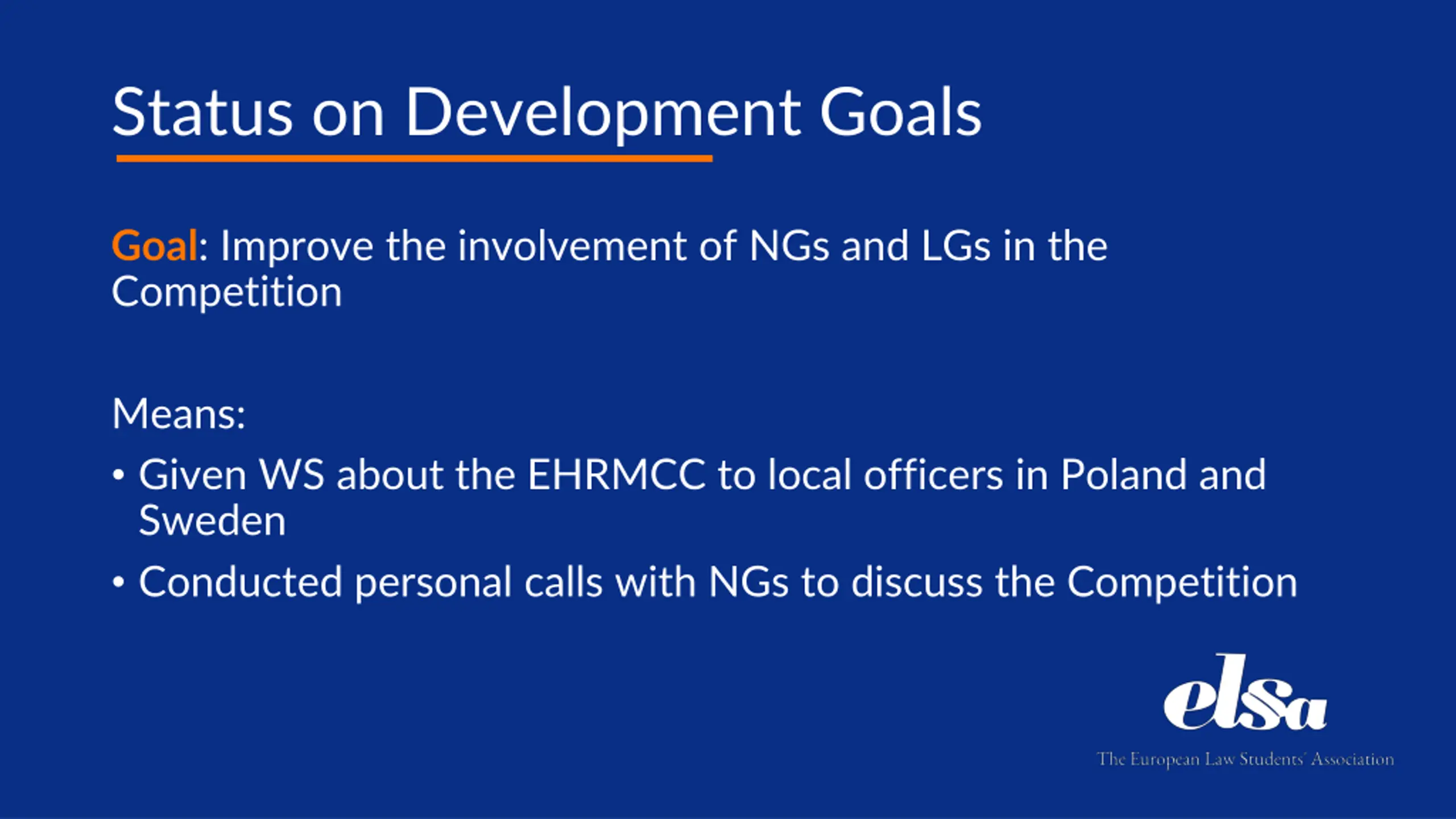 Status on Development Goals Goal: Improve the involvement of NGs and LGs in the Competition Means: Given WS about the EHRMCC to local officers in Poland and Sweden Conducted personal calls with NGs to discuss the Competition