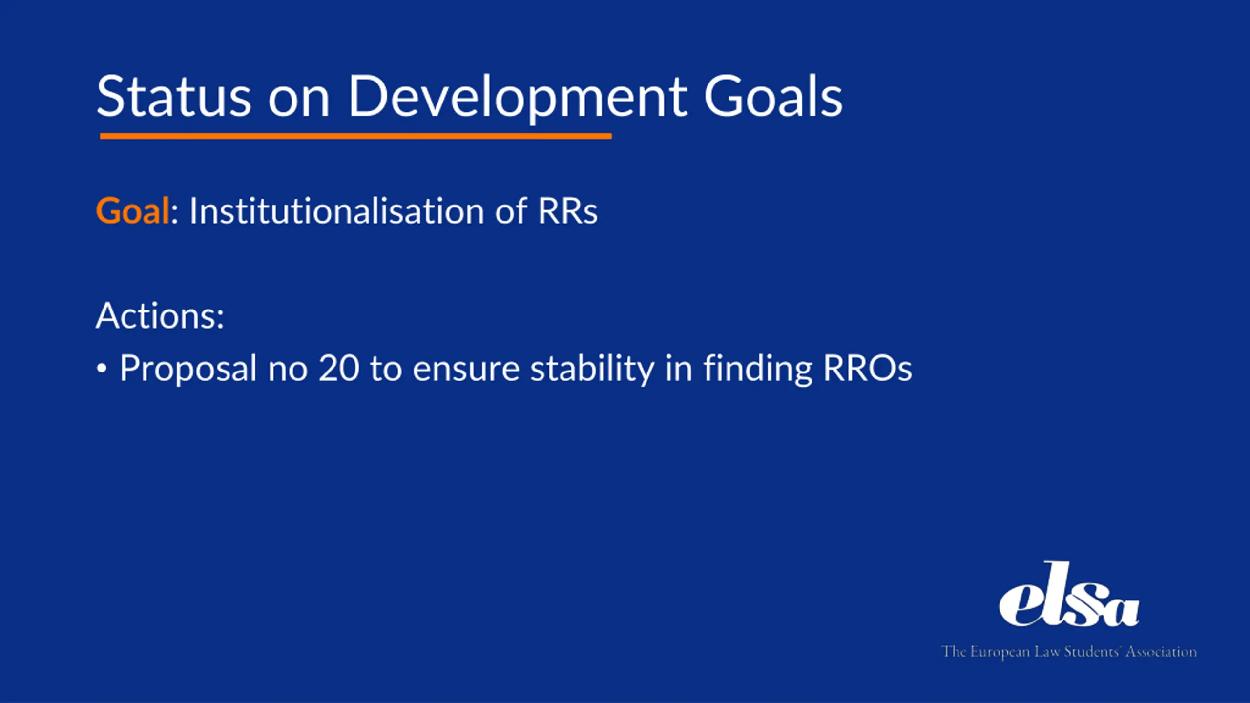 Status on Development Goals Goal: Institutionalisation of RRs Actions: Proposal no 20 to ensure stability in finding RROs