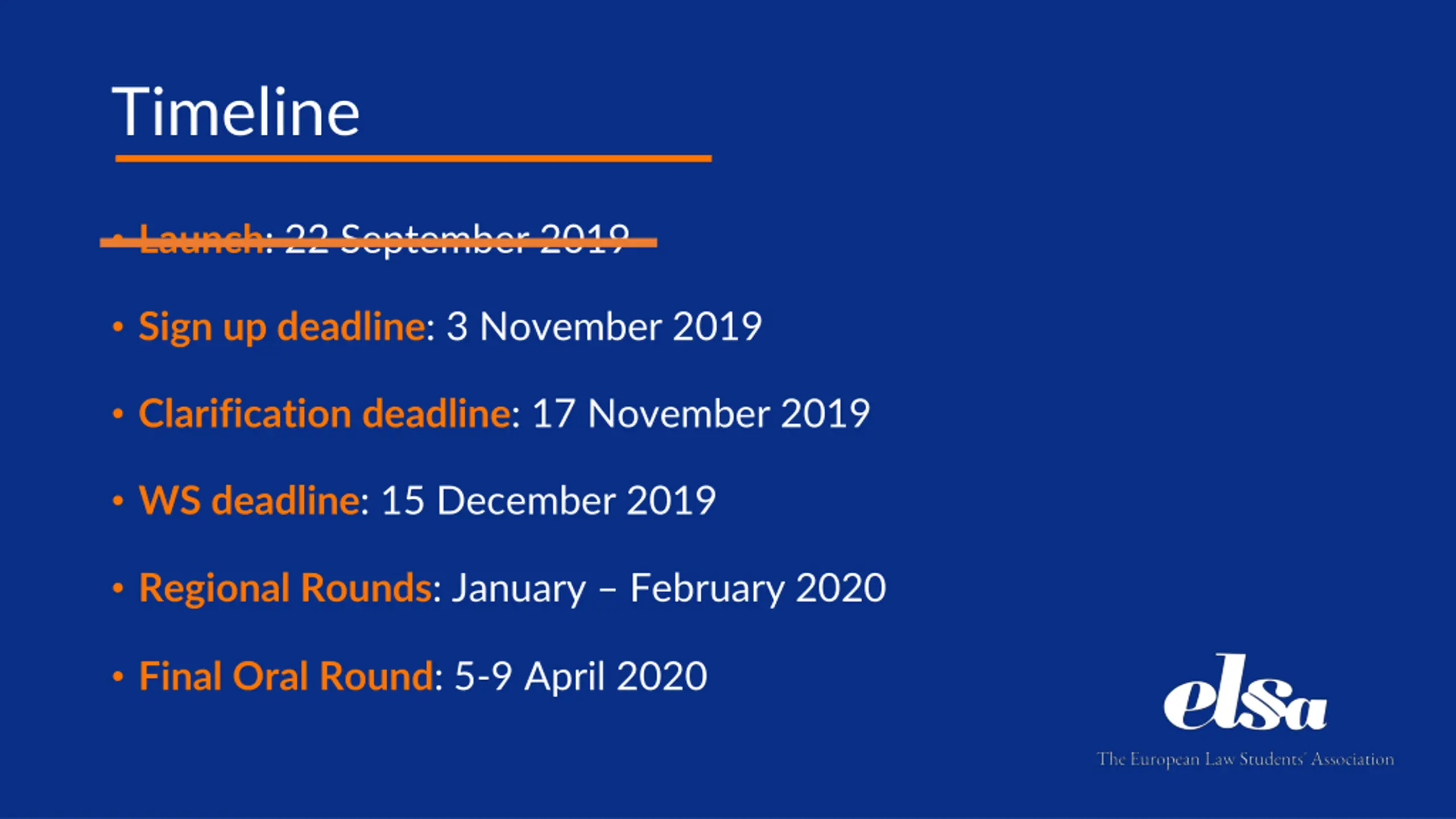 Timeline Launch: 22 September 2019 Sign up deadline: 3 November 2019 Clarificationdeadline: 17 November 2019 WS deadline: 15 December 2019 Regional Rounds: January February 2020 Final Oral Round: 5-9 April 2020