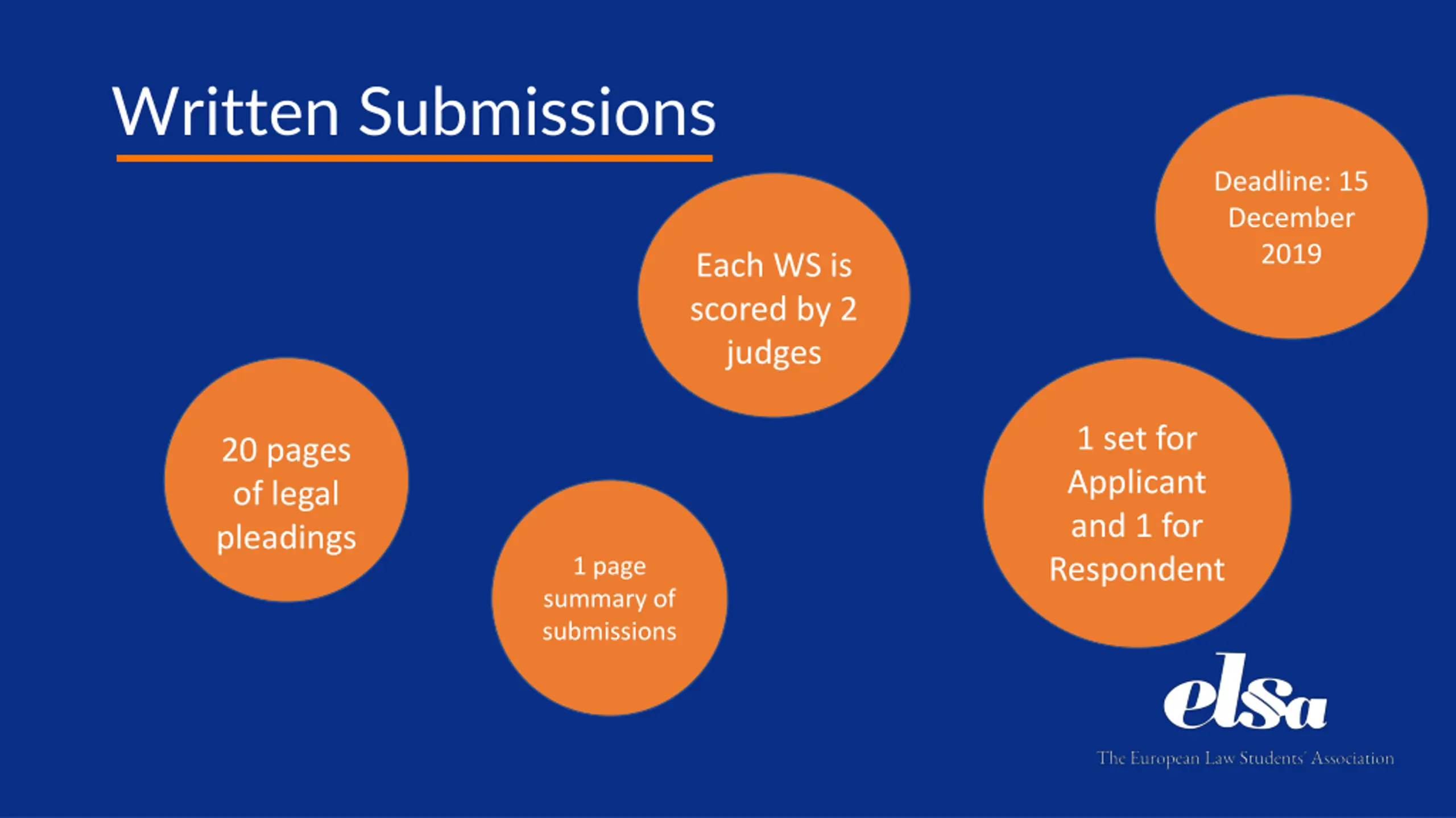 Written Submissions Deadline: 15 December 2019 Each WS is scored by 2 judges 1 set for Applicant and 1 for Respondent 20 pages of legal pleadings 1 page summary of submissions