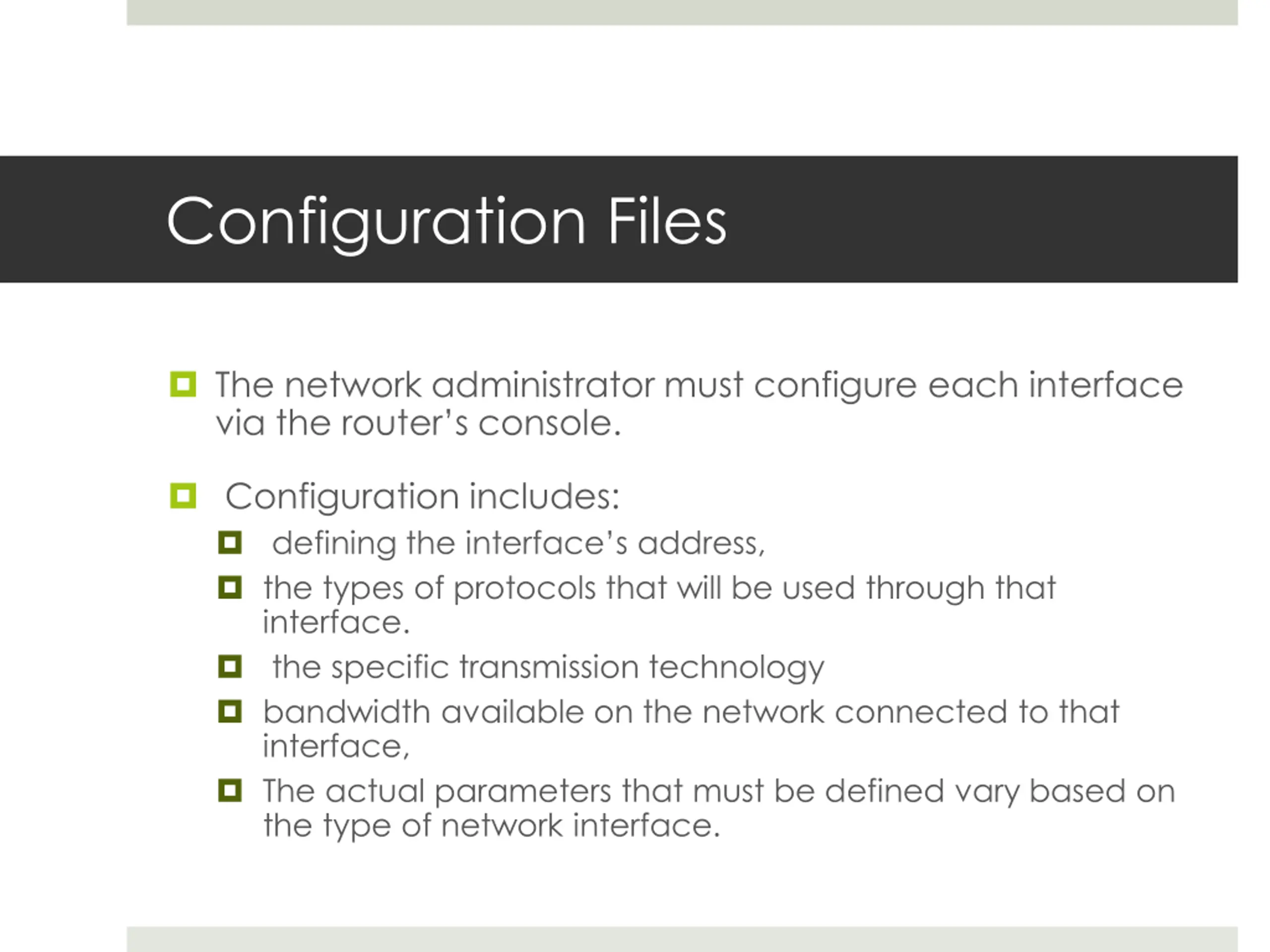 Configuration Files The network administrator must configure each interface via the router s console. Configuration includes: defining the interface s address, the types of protocols that will be used through that interface. the specific transmission technology bandwidth available on the network connected to that interface, The actual parameters that must be defined vary based on the type of network interface.