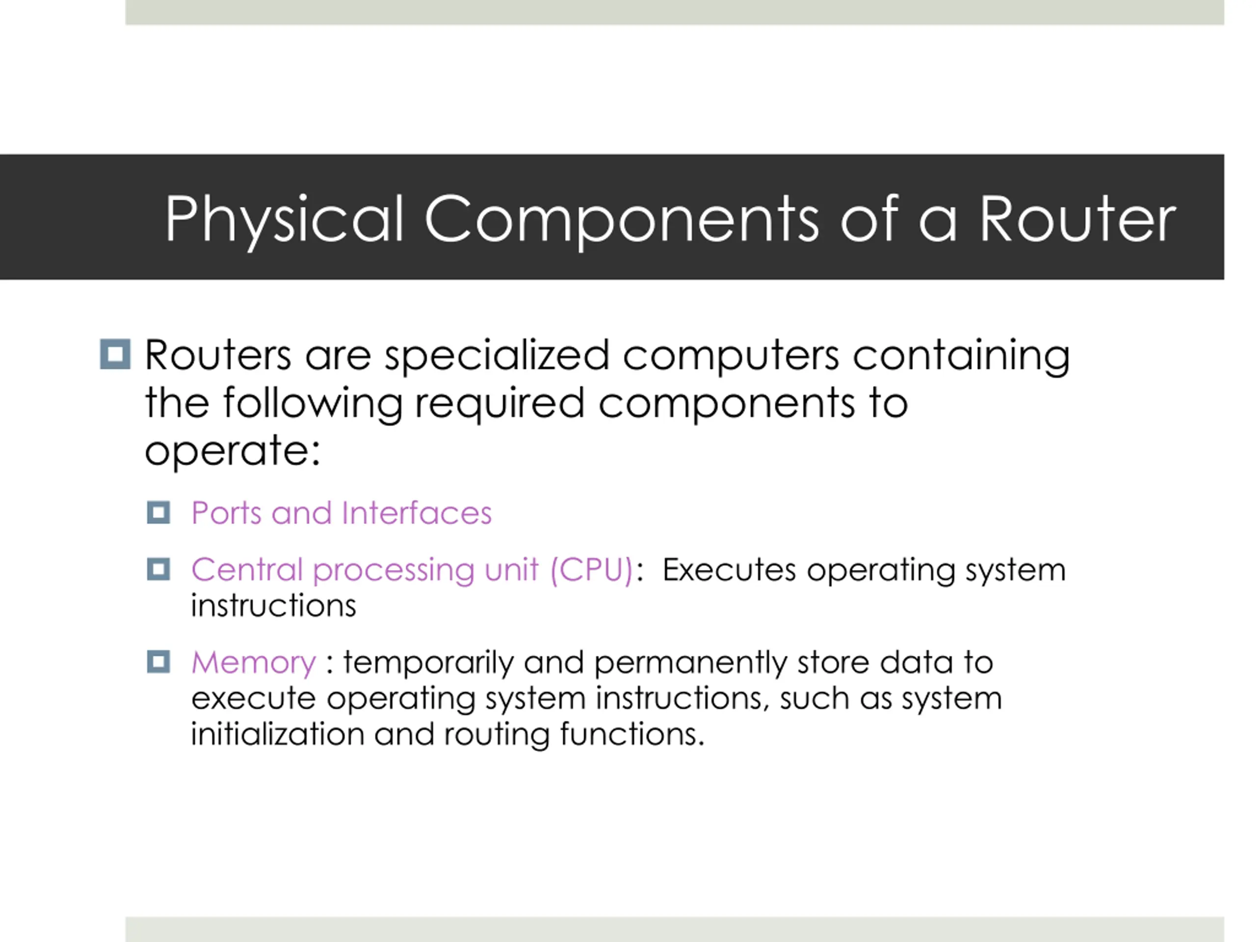 Physical Components of a Router Routers are specialized computers containing the following required components to operate: Ports and Interfaces Central processing unit (CPU): Executes operating system instructions Memory : temporarily and permanently store data to execute operating system instructions, such as system initialization and routing functions.