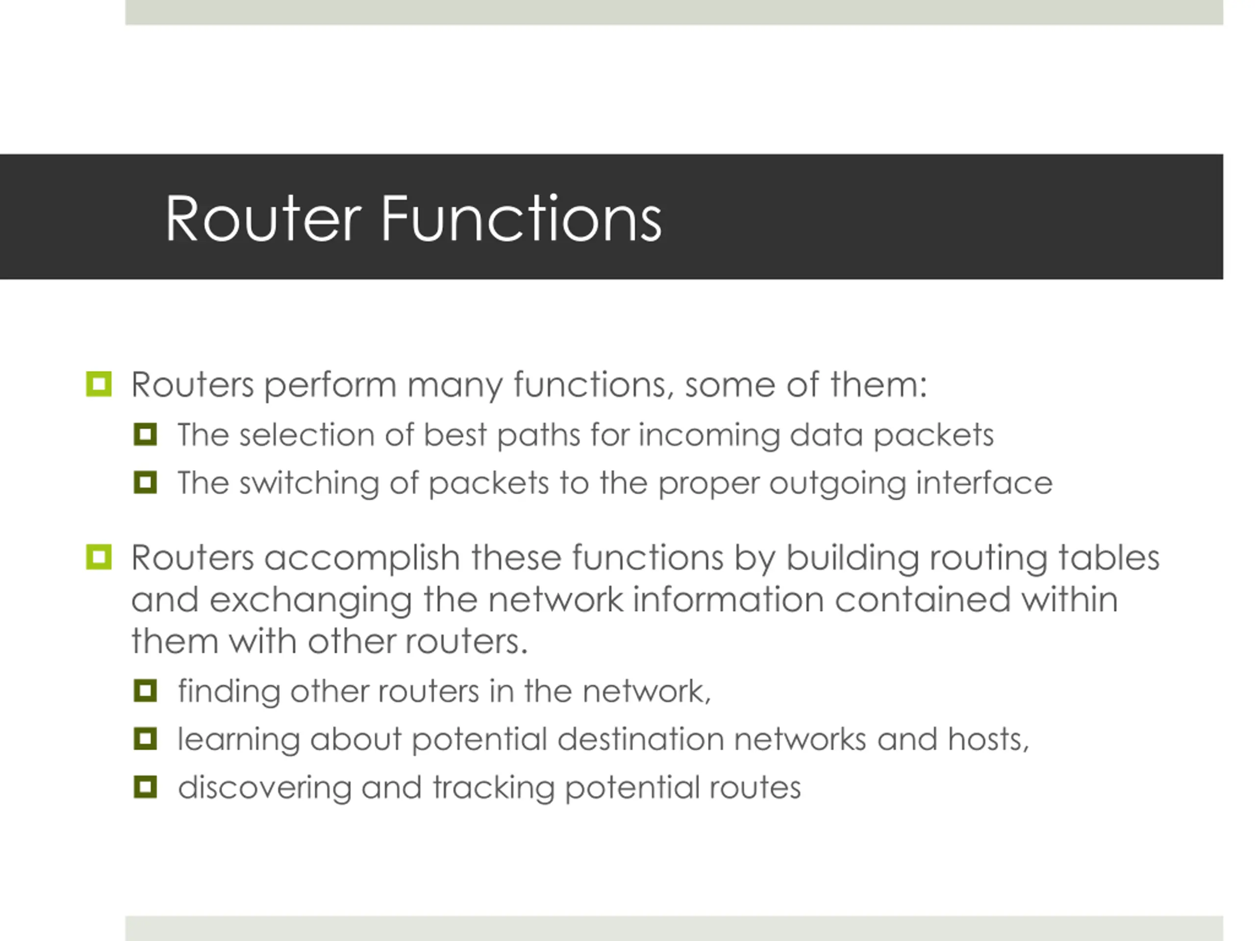 Router Functions Routers perform many functions, some of them: The selection of best paths for incoming data packets The switching of packets to the proper outgoing interface Routers accomplish these functions by building routing tables and exchanging the network information contained within them with other routers. finding other routers in the network, learning about potential destination networks and hosts, discovering and tracking potential routes