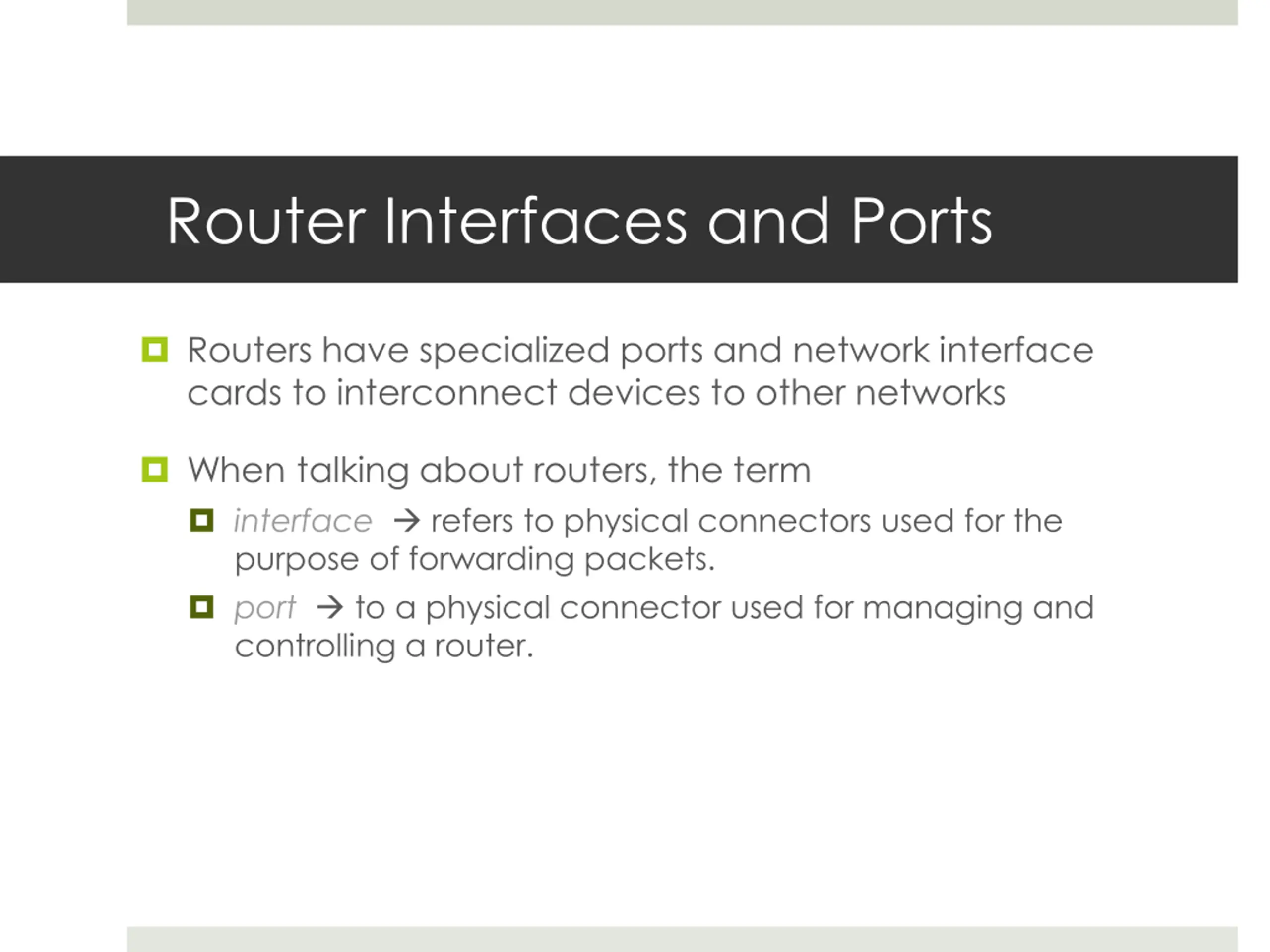 Router Interfaces and Ports Routers have specialized ports and network interface cards to interconnect devices to other networks When talking about routers, the term interface refers to physical connectors used for the purpose of forwarding packets. port to a physical connector used for managing and controlling a router.