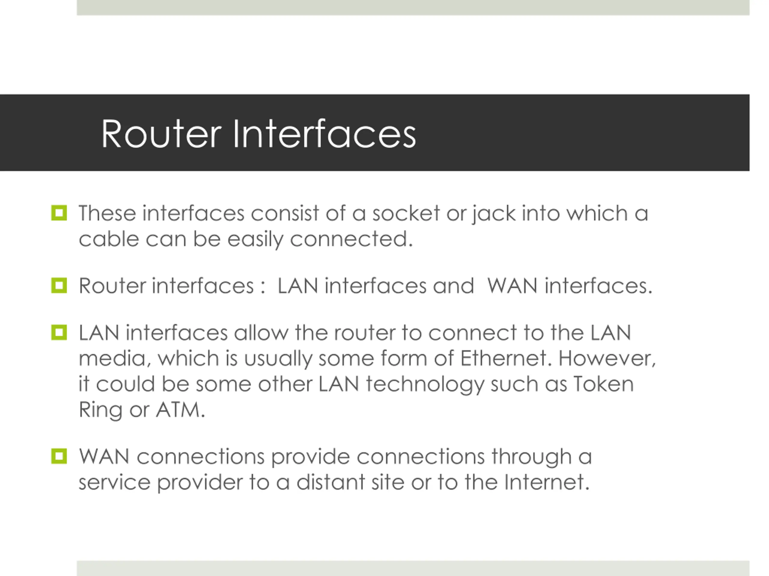 Router Interfaces These interfaces consist of a socket or jack into which a cable can be easily connected. Router interfaces : LAN interfaces and WAN interfaces. LAN interfaces allow the router to connect to the LAN media, which is usually some form of Ethernet. However, it could be some other LAN technology such as Token Ring or ATM. WAN connections provide connections through a service provider to a distant site or to the Internet.
