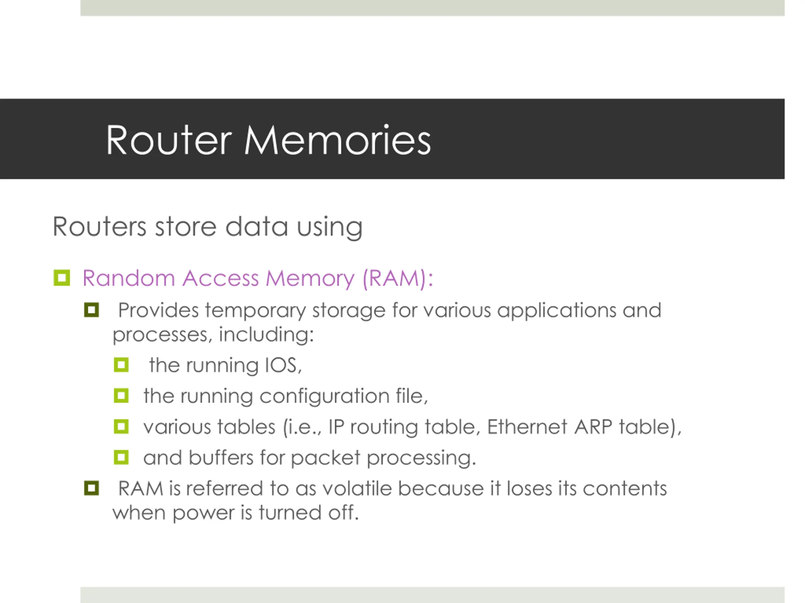 Router Memories Routers store data using Random Access Memory (RAM): Provides temporary storage for various applications and processes, including: the running IOS, the running configuration file, various tables (i.e., IP routing table, Ethernet ARP table), and buffers for packet processing. RAM is referred to as volatile because it loses its contents when power is turned off.