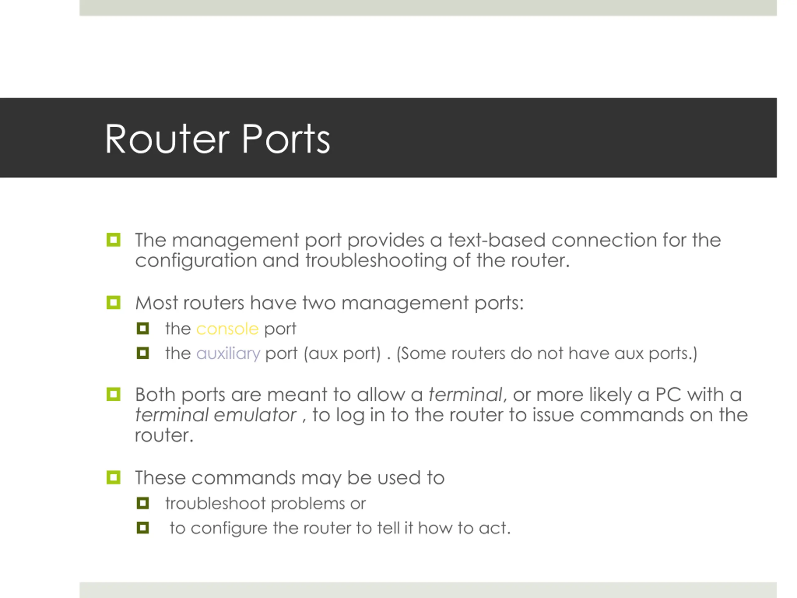 Router Ports The management port provides a text-based connection for the configuration and troubleshooting of the router. Most routers have two management ports: the console port the auxiliary port (aux port) . (Some routers do not have aux ports.) Both ports are meant to allow a terminal, or more likely a PC with a terminal emulator , to log in to the router to issue commands on the router. These commands may be used to troubleshoot problems or to configure the router to tell it how to act.