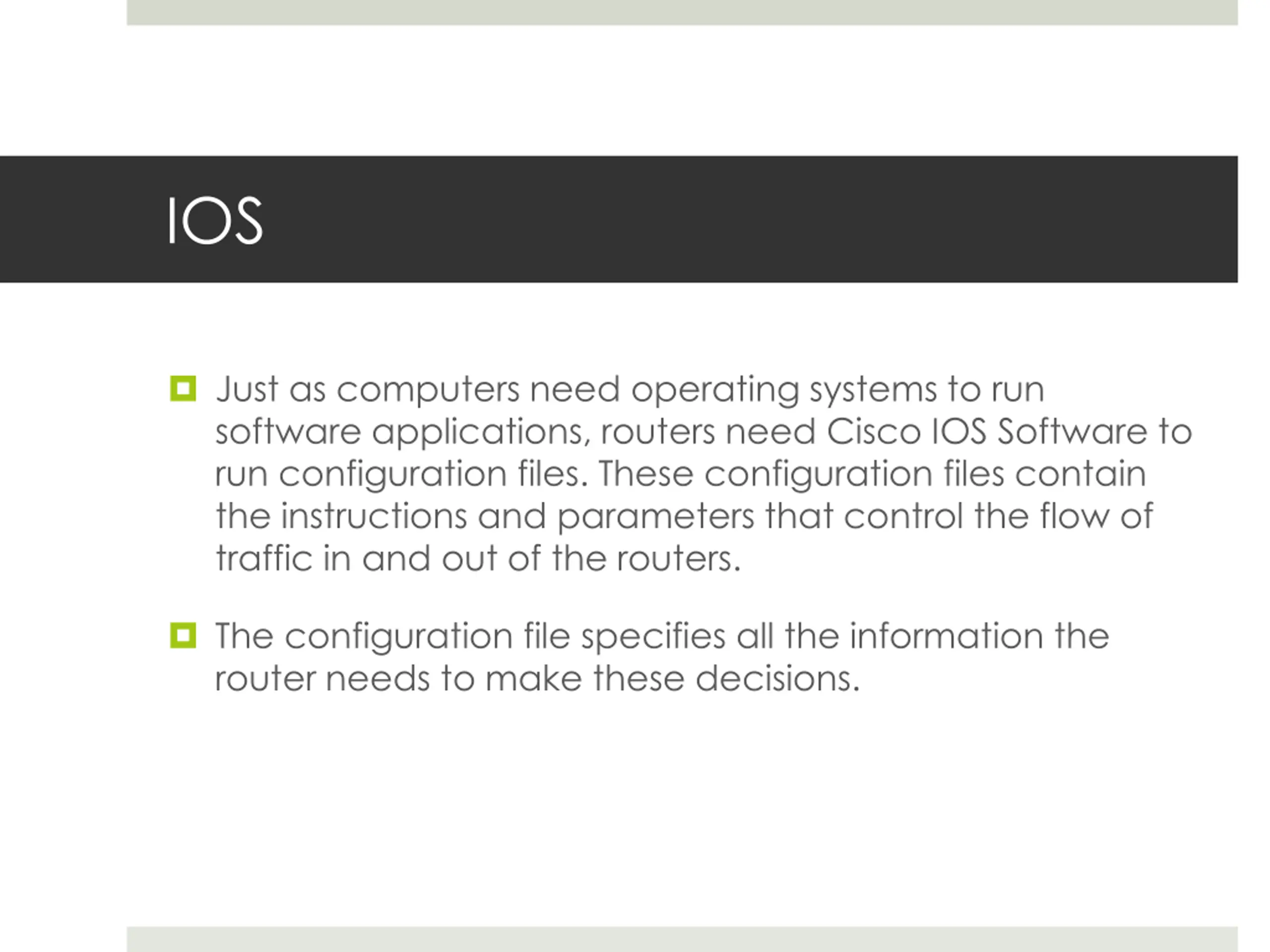 IOS Just as computers need operating systems to run software applications, routers need Cisco IOS Software to run configuration files. These configuration files contain the instructions and parameters that control the flow of traffic in and out of the routers. The configuration file specifies all the information the router needs to make these decisions.