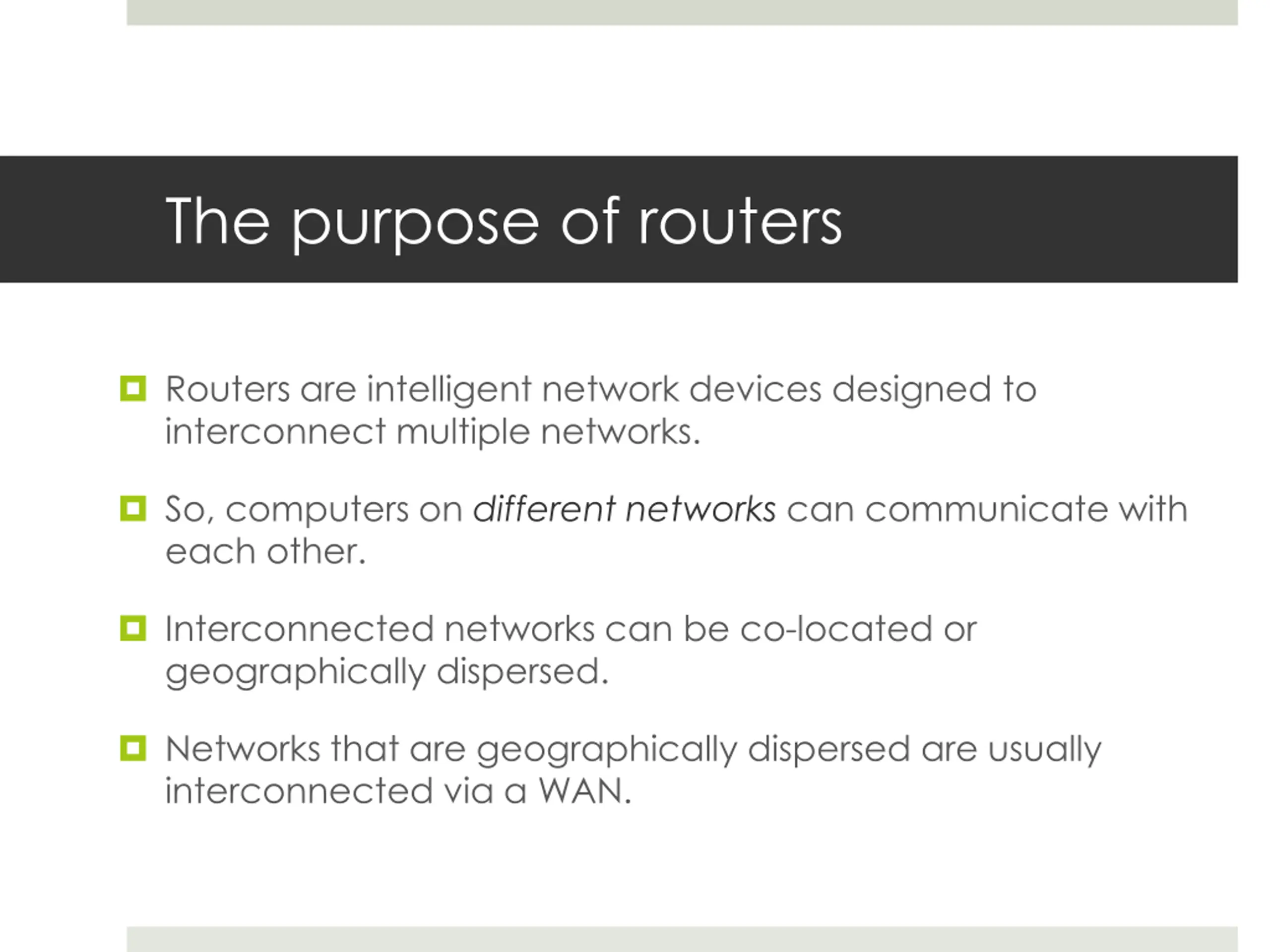 The purpose of routers Routers are intelligent network devices designed to interconnect multiple networks. So, computers on different networks can communicate with each other. Interconnected networks can be co-located or geographically dispersed. Networks that are geographically dispersed are usually interconnected via a WAN.