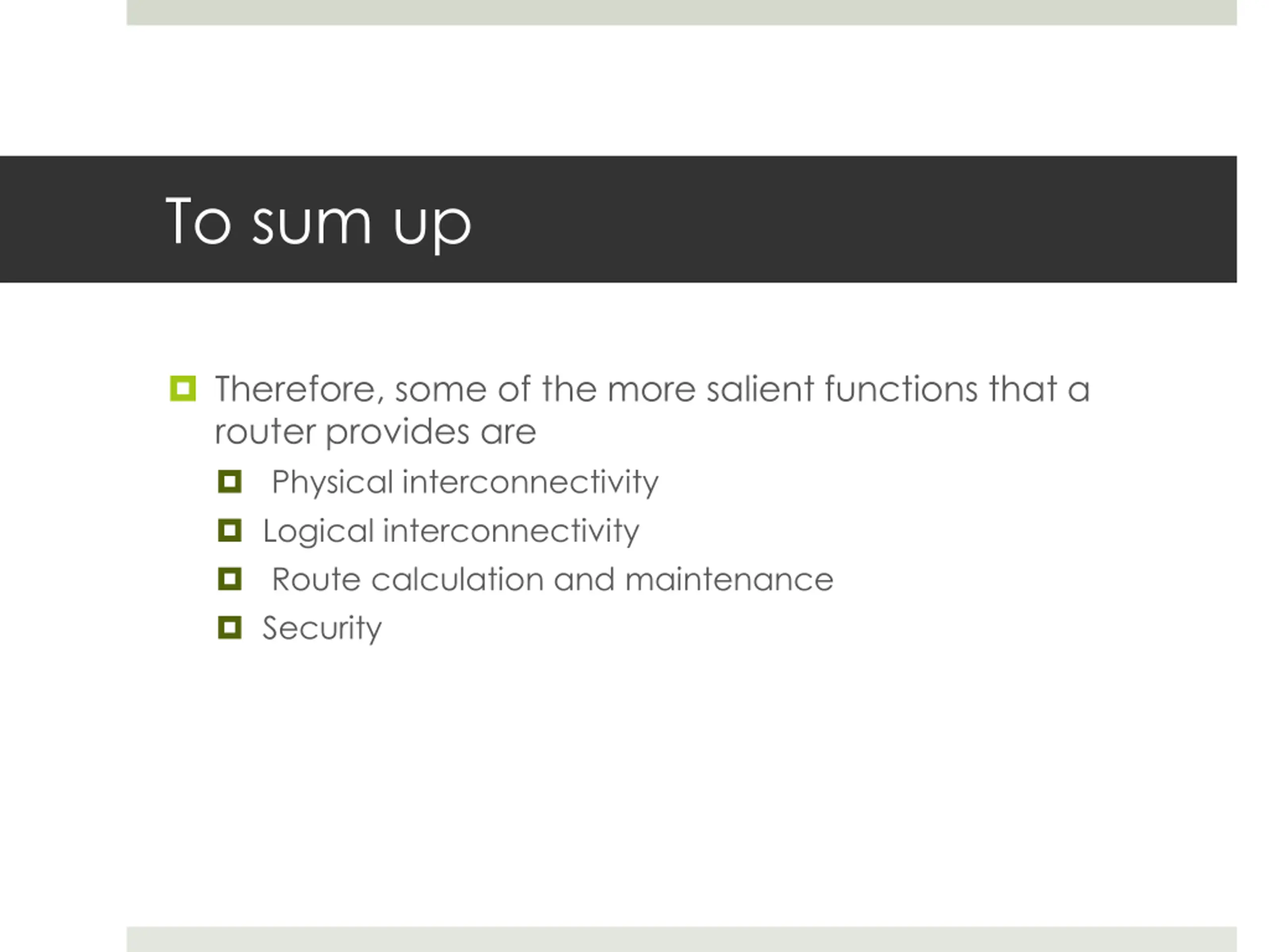 To sum up Therefore, some of the more salient functions that a router provides are Physical interconnectivity Logical interconnectivity Route calculation and maintenance Security