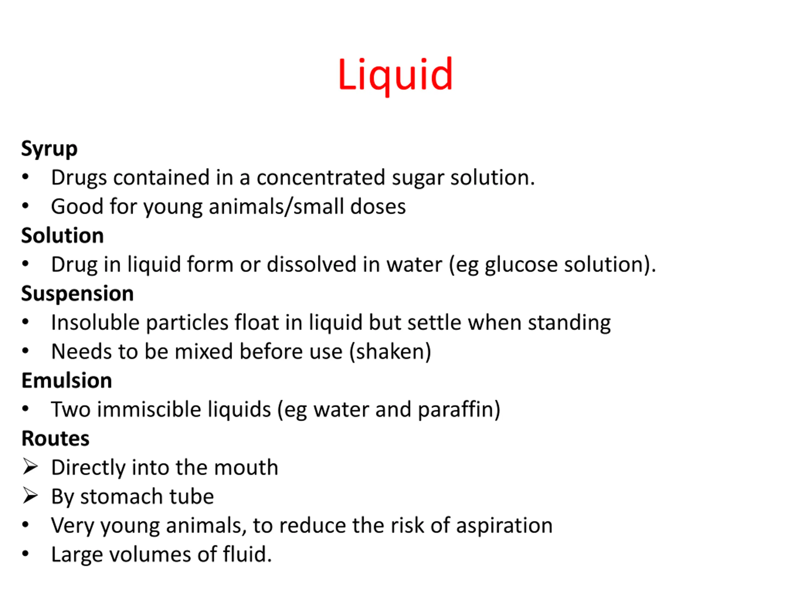Liquid Syrup Drugs contained in a concentrated sugar solution. Good for young animals/small doses Solution Drug in liquid form or dissolved in water (eg glucose solution). Suspension Insoluble particles float in liquid but settle when standing Needs to be mixed before use (shaken) Emulsion Two immiscible liquids (eg water and paraffin) Routes Directly into the mouth By stomach tube Very young animals, to reduce the risk of aspiration Large volumes of fluid.