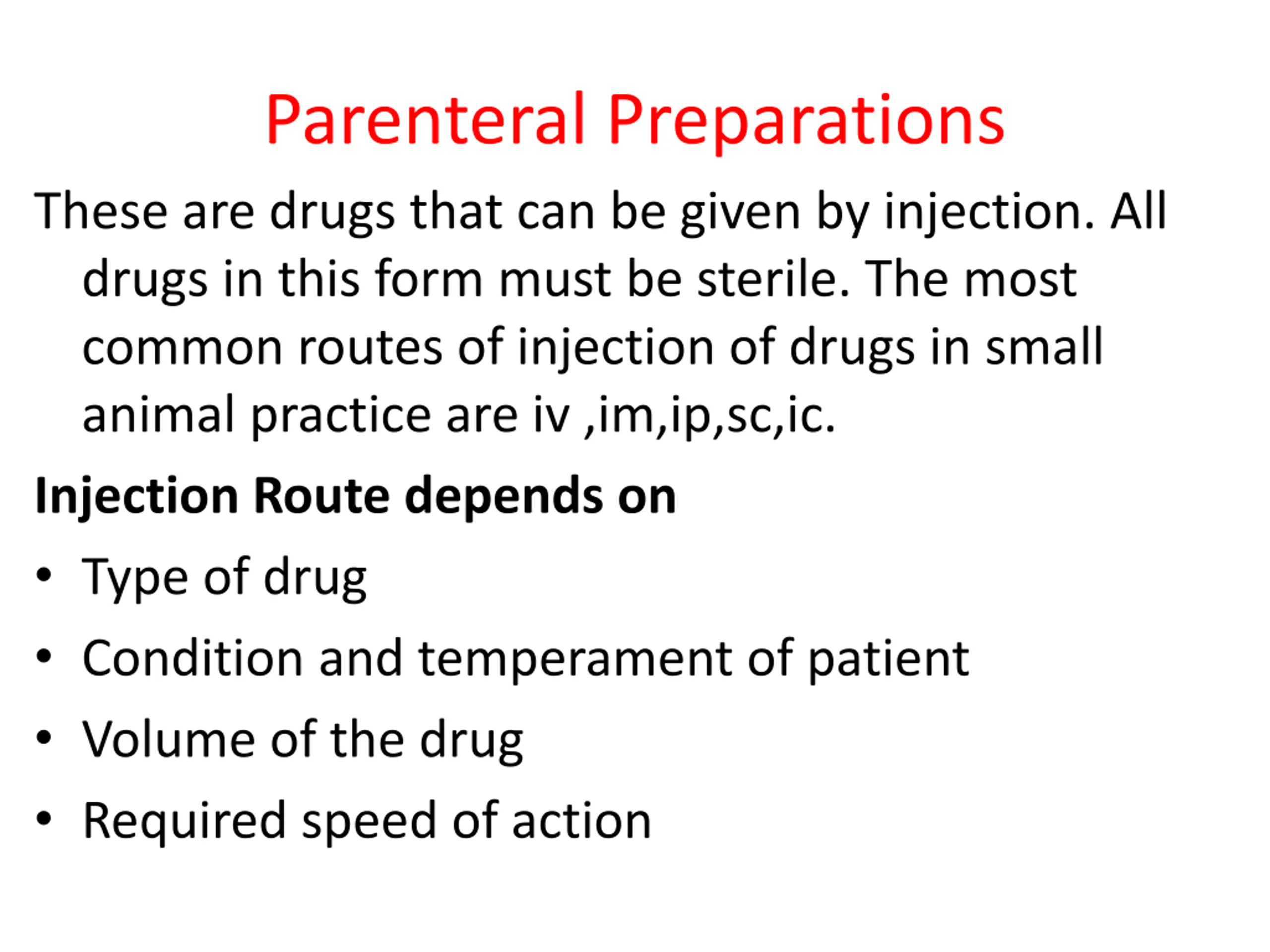 Parenteral Preparations These are drugs that can be given by injection. All drugs in this form must be sterile. The most common routes of injection of drugs in small animal practice are iv ,im,ip,sc,ic. Injection Route depends on Type of drug Condition and temperament of patient Volume of the drug Required speed of action