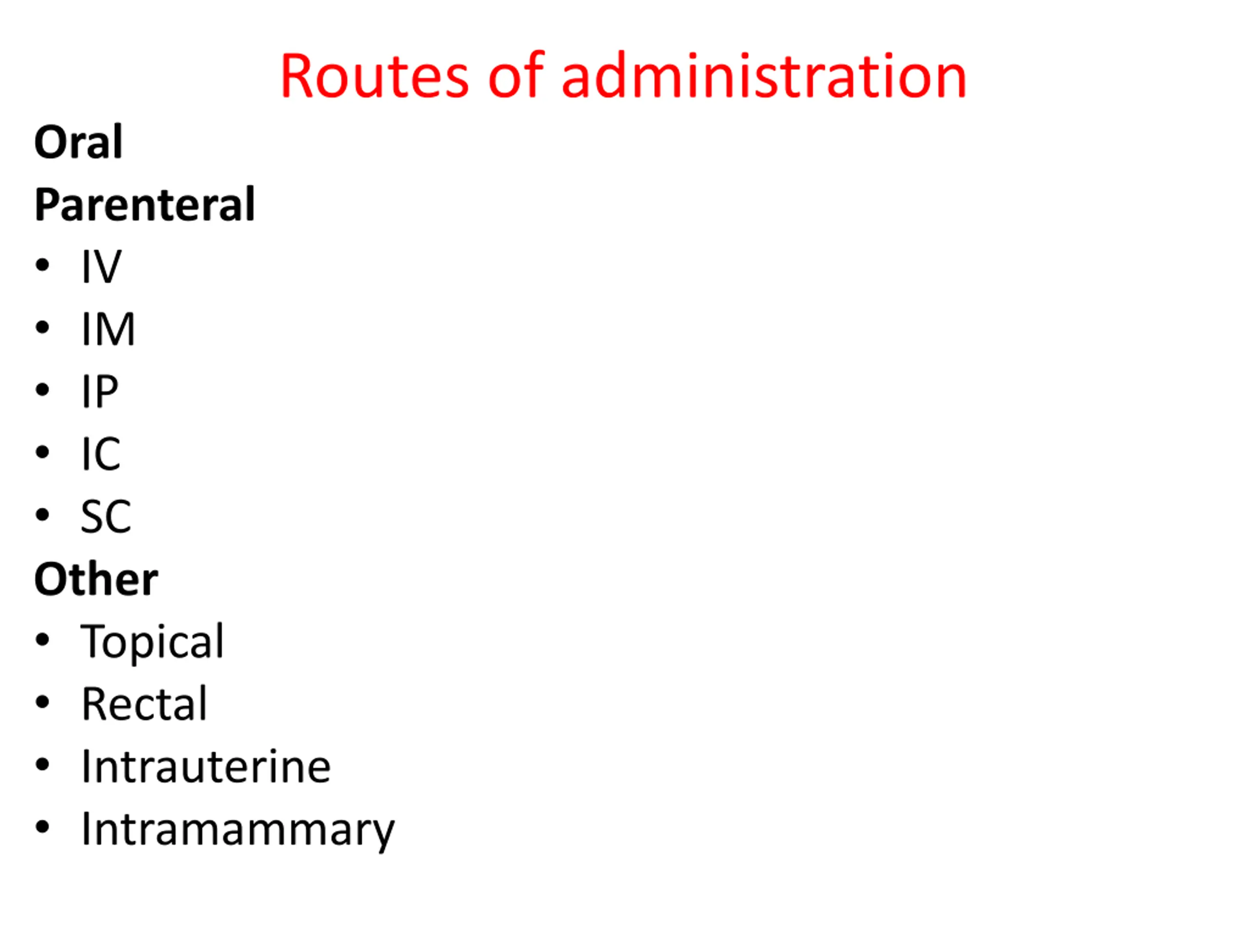 Routes of administration Oral Parenteral IV IM IP IC SC Other Topical Rectal Intrauterine Intramammary