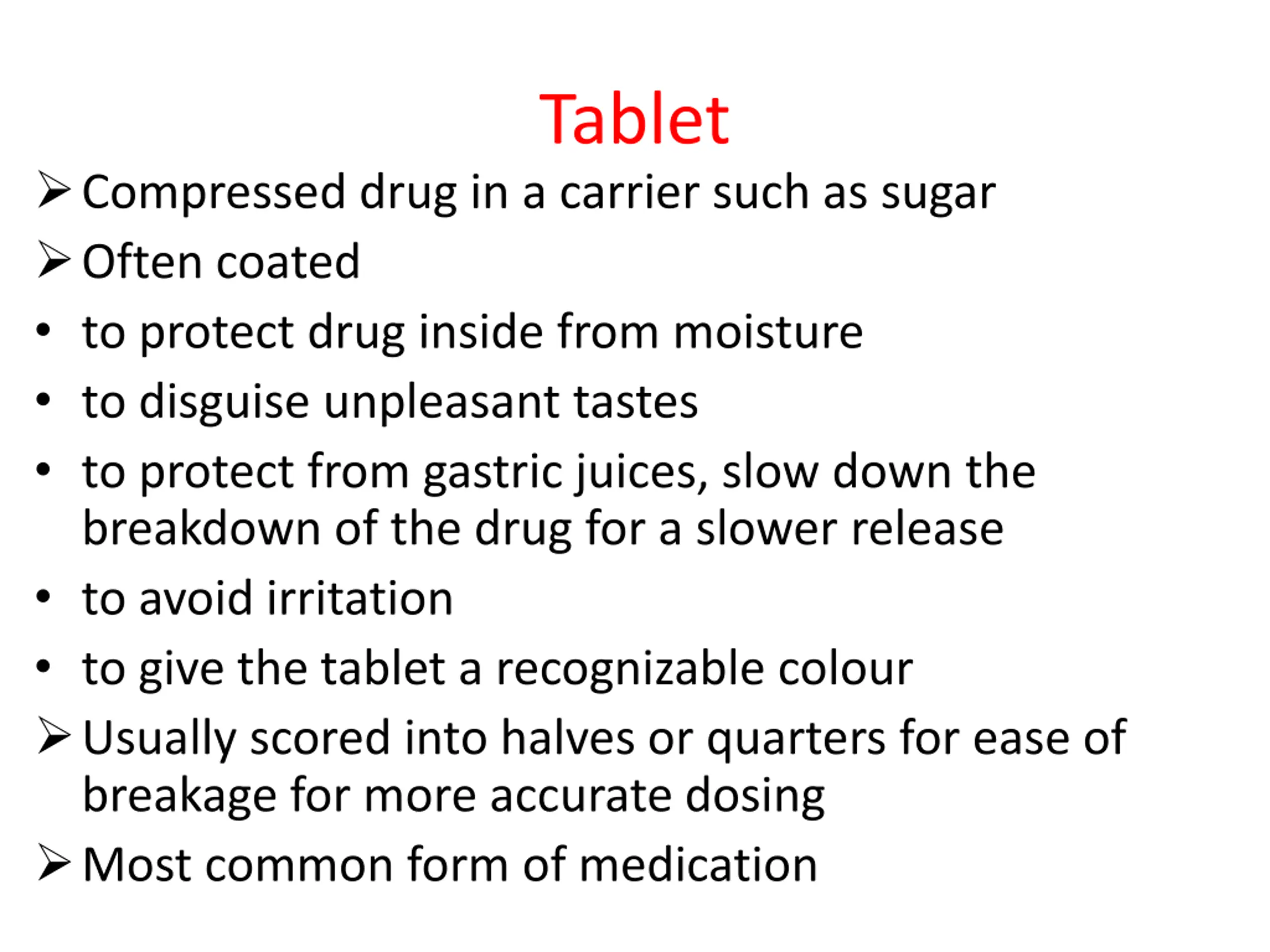 Tablet Compressed drug in a carrier such as sugar Often coated to protect drug inside from moisture to disguise unpleasant tastes to protect from gastric juices, slow down the breakdown of the drug for a slower release to avoid irritation to give the tablet a recognizable colour Usually scored into halves or quarters for ease of breakage for more accurate dosing Most common form of medication