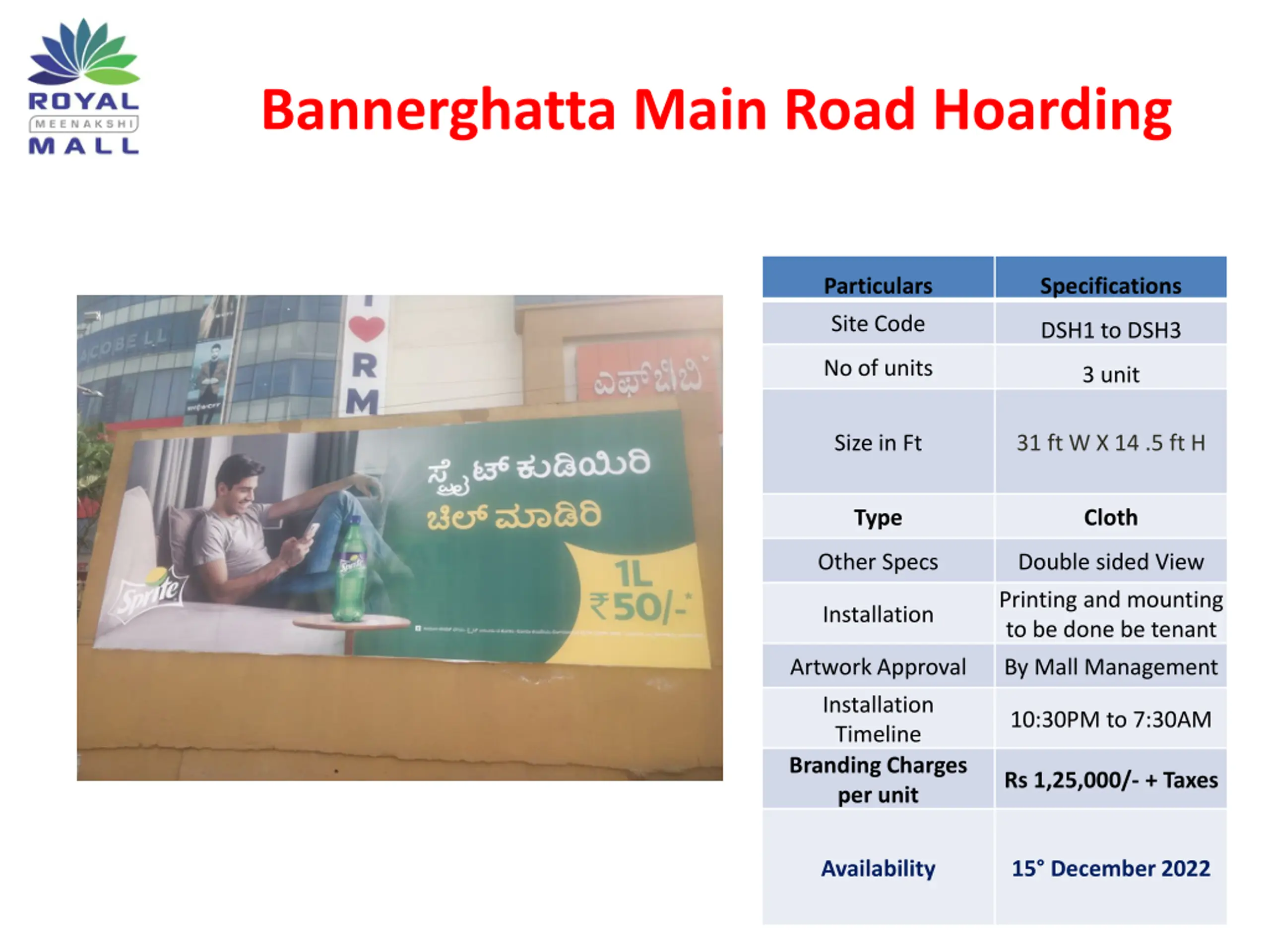 Bannerghatta Main Road Hoarding Particulars Specifications Site Code DSH1 to DSH3 No of units 3 unit Size in Ft 31 ft W X 14 .5 ft H Type Cloth Other Specs Double sided View Printing and mounting to be done be tenant Installation Artwork Approval By Mall Management Installation Timeline Branding Charges per unit 10:30PM to 7:30AM Rs 1,25,000/- + Taxes Availability 15 December 2022