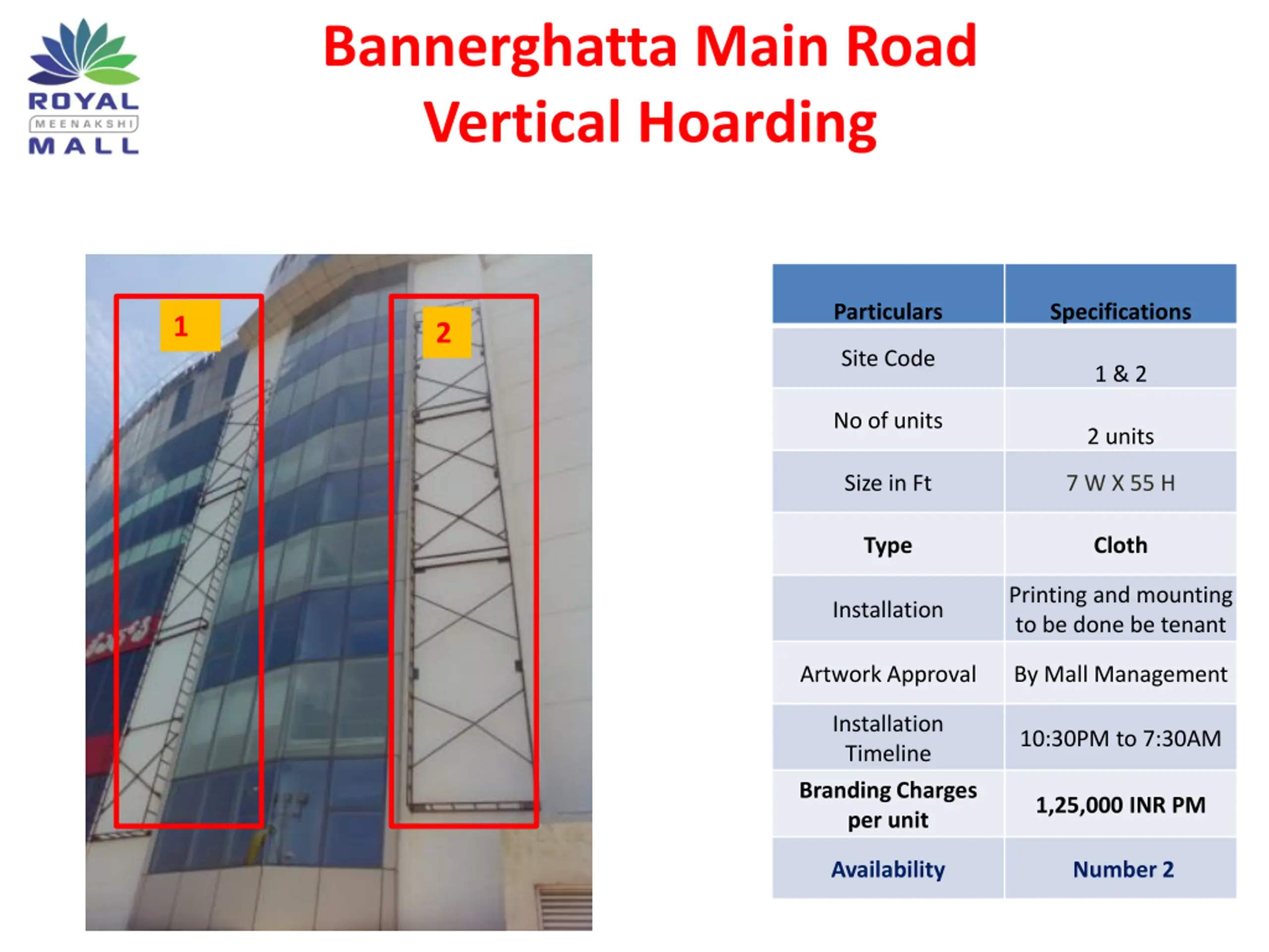 Bannerghatta Main Road Vertical Hoarding Particulars Specifications 1 2 Site Code 1 & 2 No of units 2 units Size in Ft 7 W X 55 H Type Cloth Printing and mounting to be done be tenant Installation Artwork Approval By Mall Management Installation Timeline Branding Charges per unit 10:30PM to 7:30AM 1,25,000 INR PM Availability Number 2