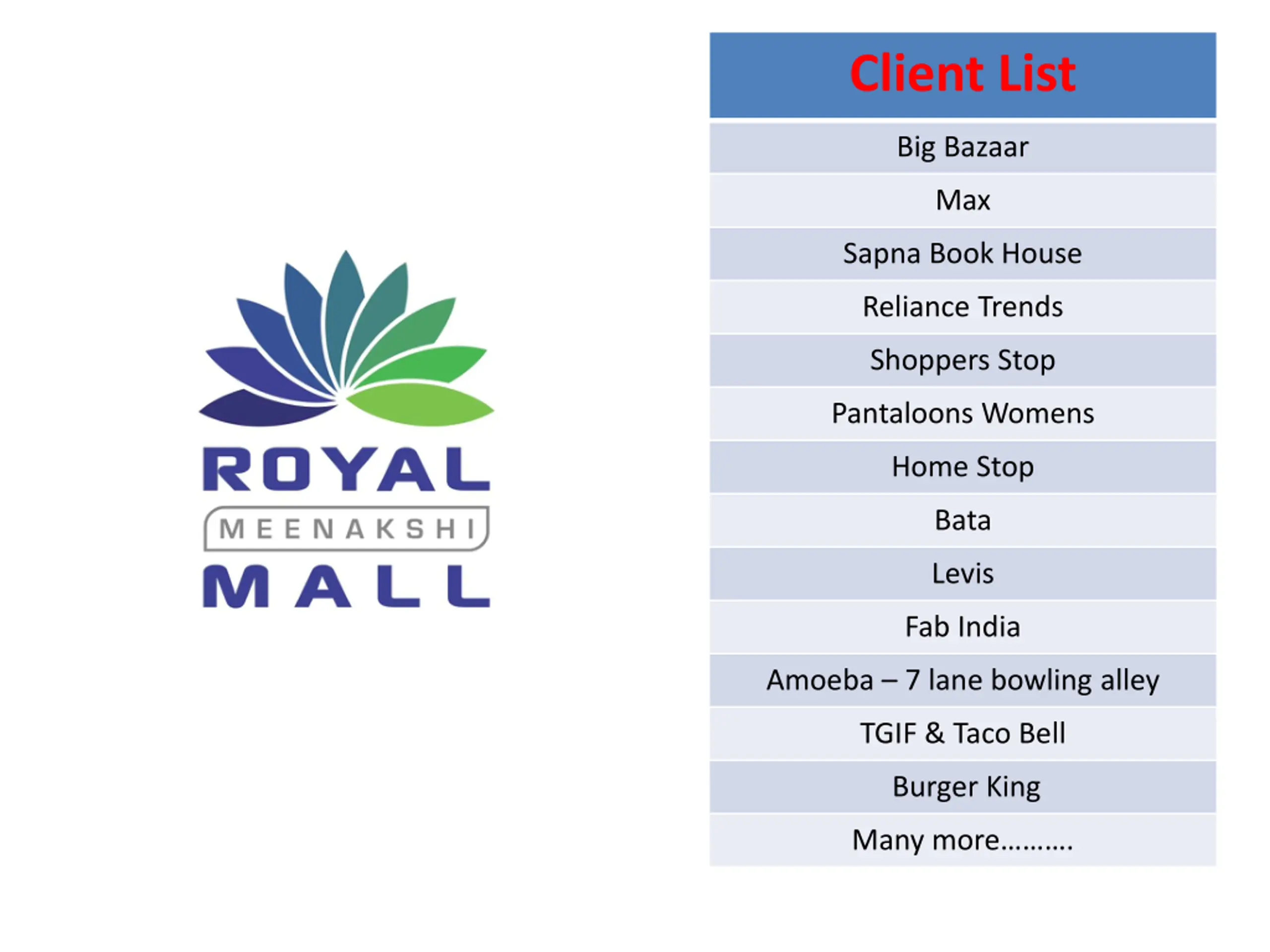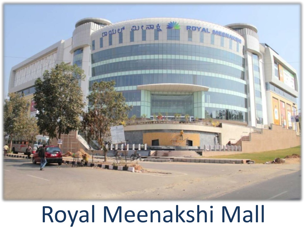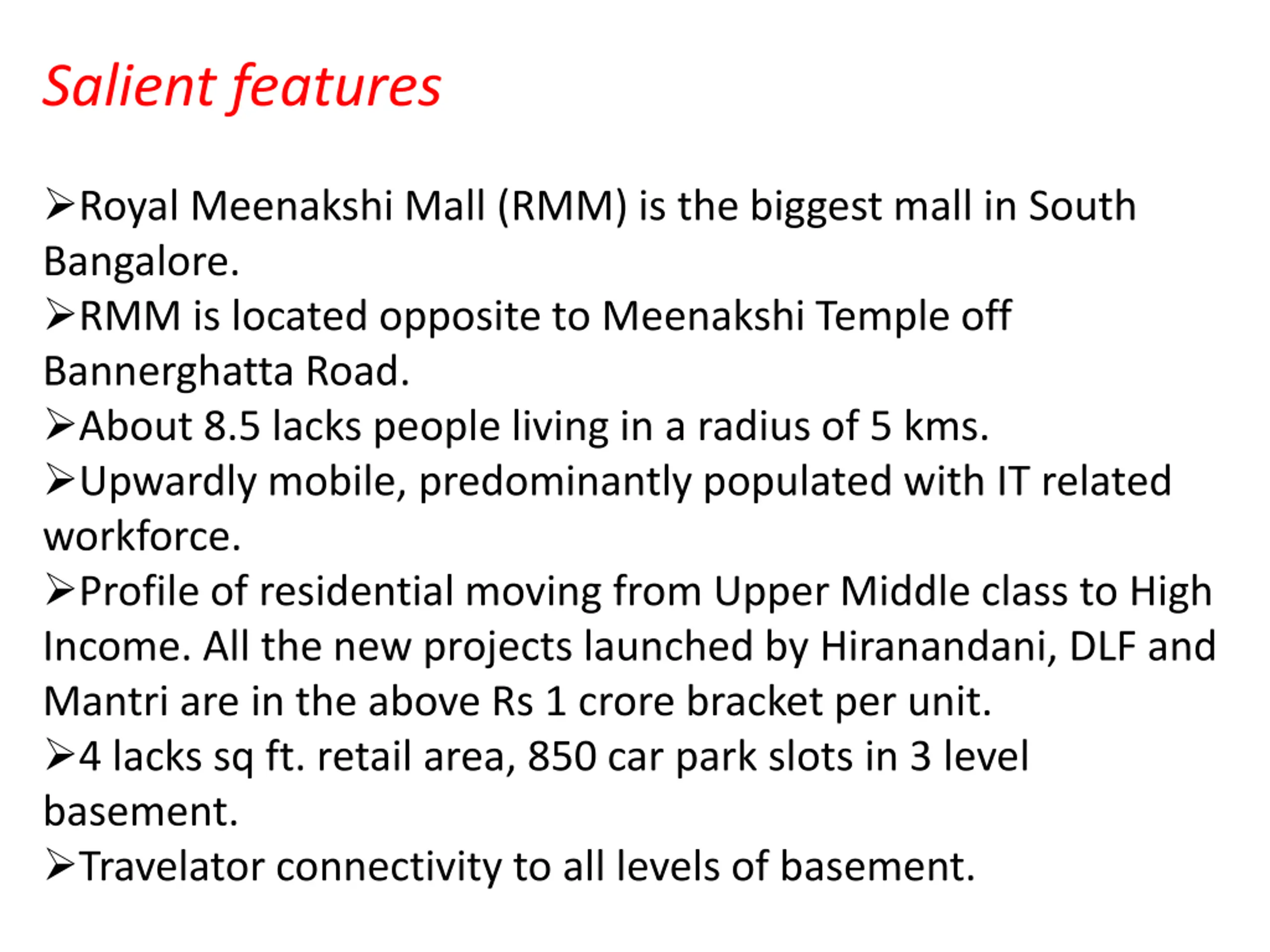 Salient features Royal Meenakshi Mall (RMM) is the biggest mall in South Bangalore. RMM is located opposite to Meenakshi Temple off Bannerghatta Road. About 8.5 lacks people living in a radius of 5 kms. Upwardly mobile, predominantly populated with IT related workforce. Profile of residential moving from Upper Middle class to High Income. All the new projects launched by Hiranandani, DLF and Mantri are in the above Rs 1 crore bracket per unit. 4 lacks sq ft. retail area, 850 car park slots in 3 level basement. Travelator connectivity to all levels of basement.