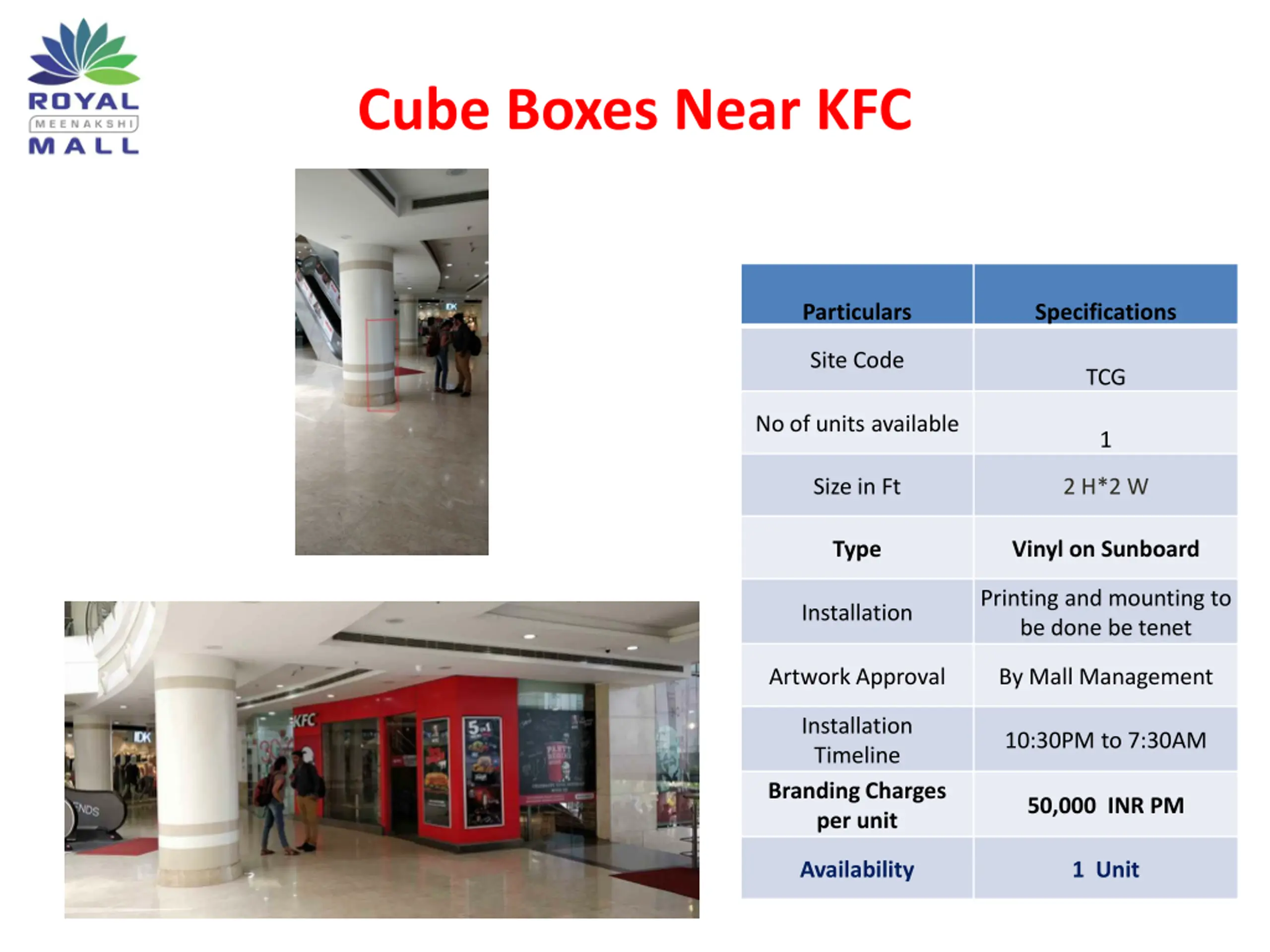 Cube Boxes Near KFC Particulars Specifications Site Code TCG No of units available 1 Size in Ft 2 H*2 W Type Vinyl on Sunboard Printing and mounting to be done be tenet Installation Artwork Approval By Mall Management Installation Timeline Branding Charges per unit 10:30PM to 7:30AM 50,000 INR PM Availability 1 Unit