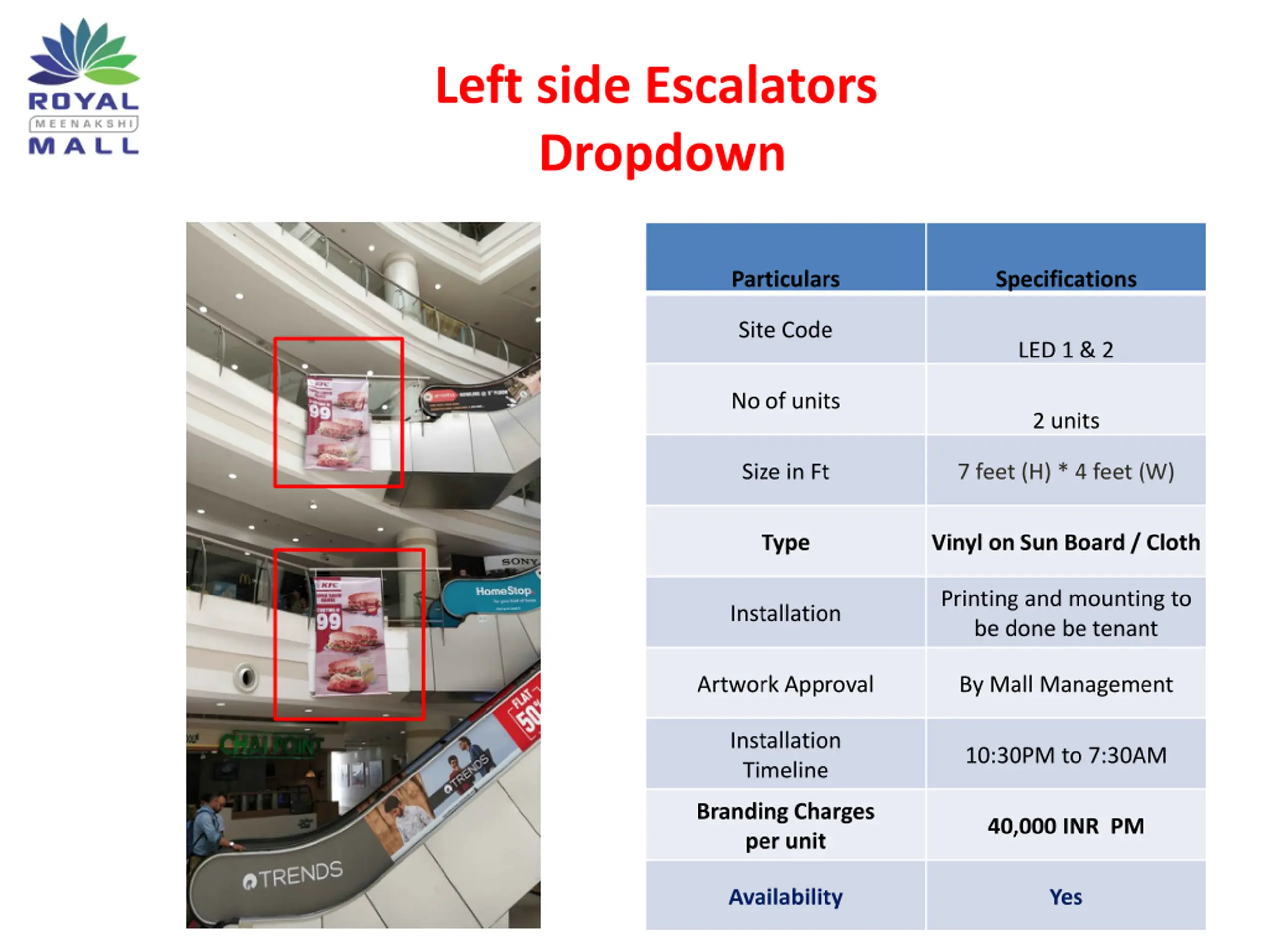 Left side Escalators Dropdown Particulars Specifications Site Code LED 1 & 2 No of units 2 units Size in Ft 7 feet (H) * 4 feet (W) Type Vinyl on Sun Board / Cloth Printing and mounting to be done be tenant Installation Artwork Approval By Mall Management Installation Timeline 10:30PM to 7:30AM Branding Charges per unit 40,000 INR PM Availability Yes