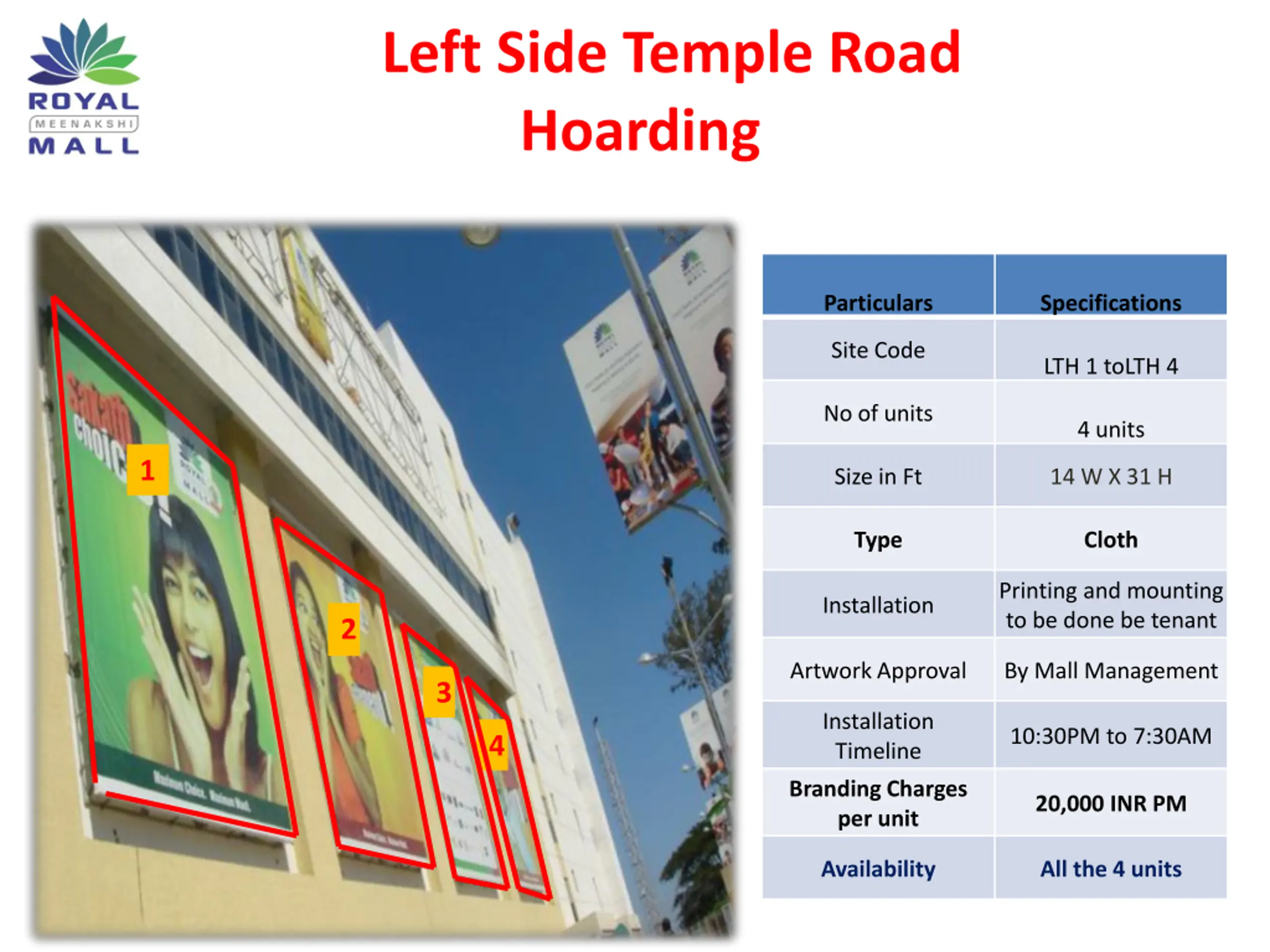 Left Side Temple Road Hoarding Particulars Specifications Site Code LTH 1 toLTH 4 No of units 4 units 1 Size in Ft 14 W X 31 H Type Cloth Printing and mounting to be done be tenant Installation 2 Artwork Approval By Mall Management 3 Installation Timeline 10:30PM to 7:30AM 4 Branding Charges per unit 20,000 INR PM Availability All the 4 units