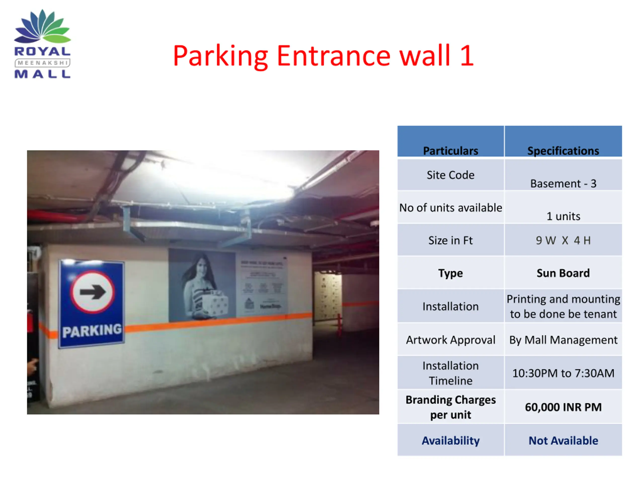 Parking Entrance wall 1 Particulars Specifications Site Code Basement - 3 No of units available 1 units Size in Ft 9 W X 4 H Type Sun Board Printing and mounting to be done be tenant Installation Artwork Approval By Mall Management Installation Timeline 10:30PM to 7:30AM Branding Charges per unit 60,000 INR PM Availability Not Available