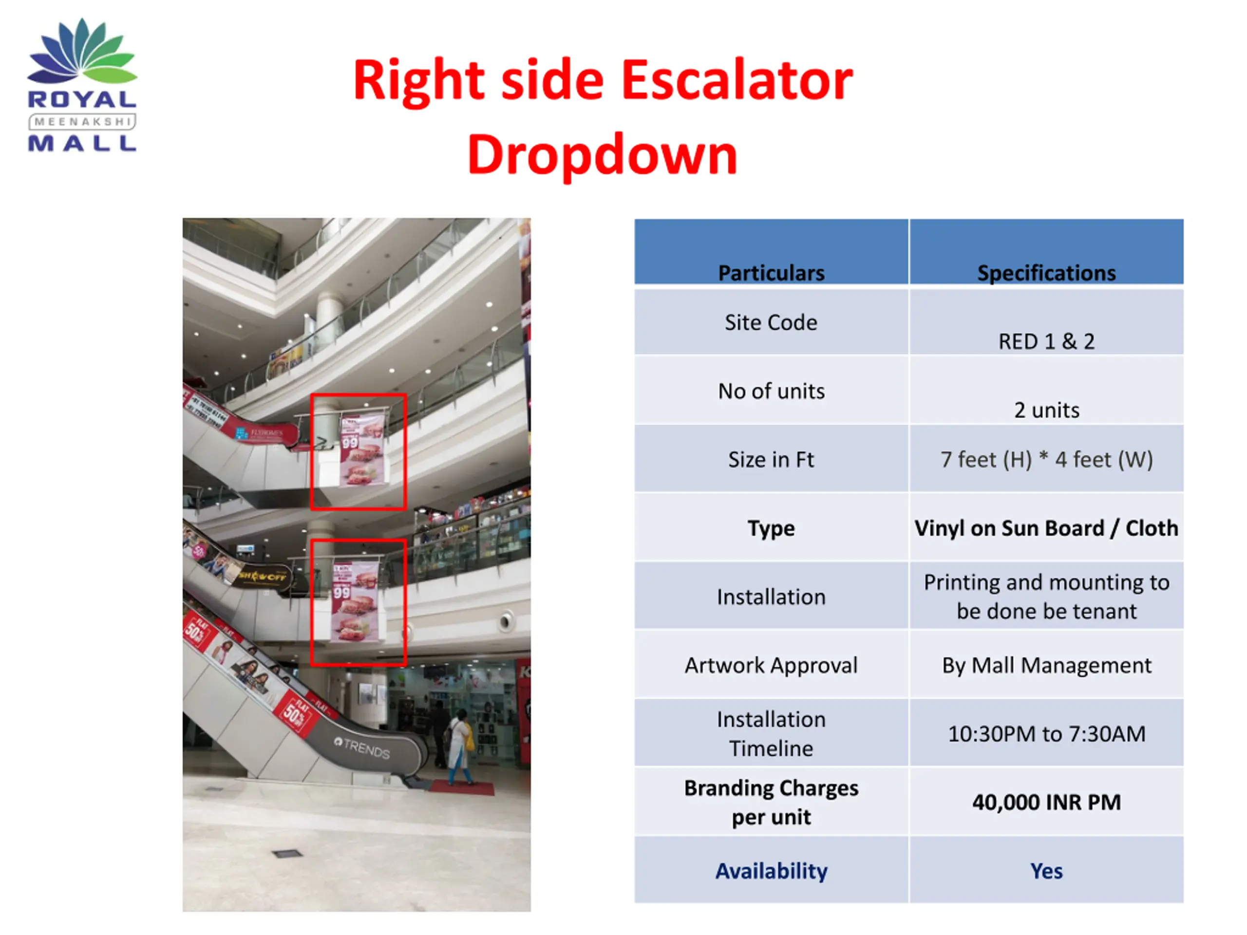 Right side Escalator Dropdown Particulars Specifications Site Code RED 1 & 2 No of units 2 units Size in Ft 7 feet (H) * 4 feet (W) Type Vinyl on Sun Board / Cloth Printing and mounting to be done be tenant Installation Artwork Approval By Mall Management Installation Timeline 10:30PM to 7:30AM Branding Charges per unit 40,000 INR PM Availability Yes